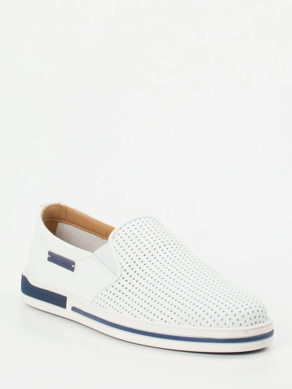 Sommerkomfort in stilvoller Form.Galizio Torresi präsentiert mit diesem Slipper ein Herrenmodell für entspannte Freizeitlooks. Weißes Kalbleder mit markanter Lochstruktur und matter Oberfläche sorgt für ein angenehm luftiges Tragegefühl an warmen Tagen. Die flache, rund gehaltene Silhouette wird durch blaue Kontraste an Sohlenrand und Label betont. Dank seitlicher Elasteinsätze und gepolsterter, herausnehmbarer Innensohle überzeugt das Modell durch hohen Komfort. Die rutschhemmende Gummisohle komplettiert die Funktionalität im Alltag. Stilistisch inspiriert von Clean Aesthetics und maritimer Casualwear. Galizio Torresi steht für detailverliebte Handwerkskunst und sommerliche Leichtigkeit.