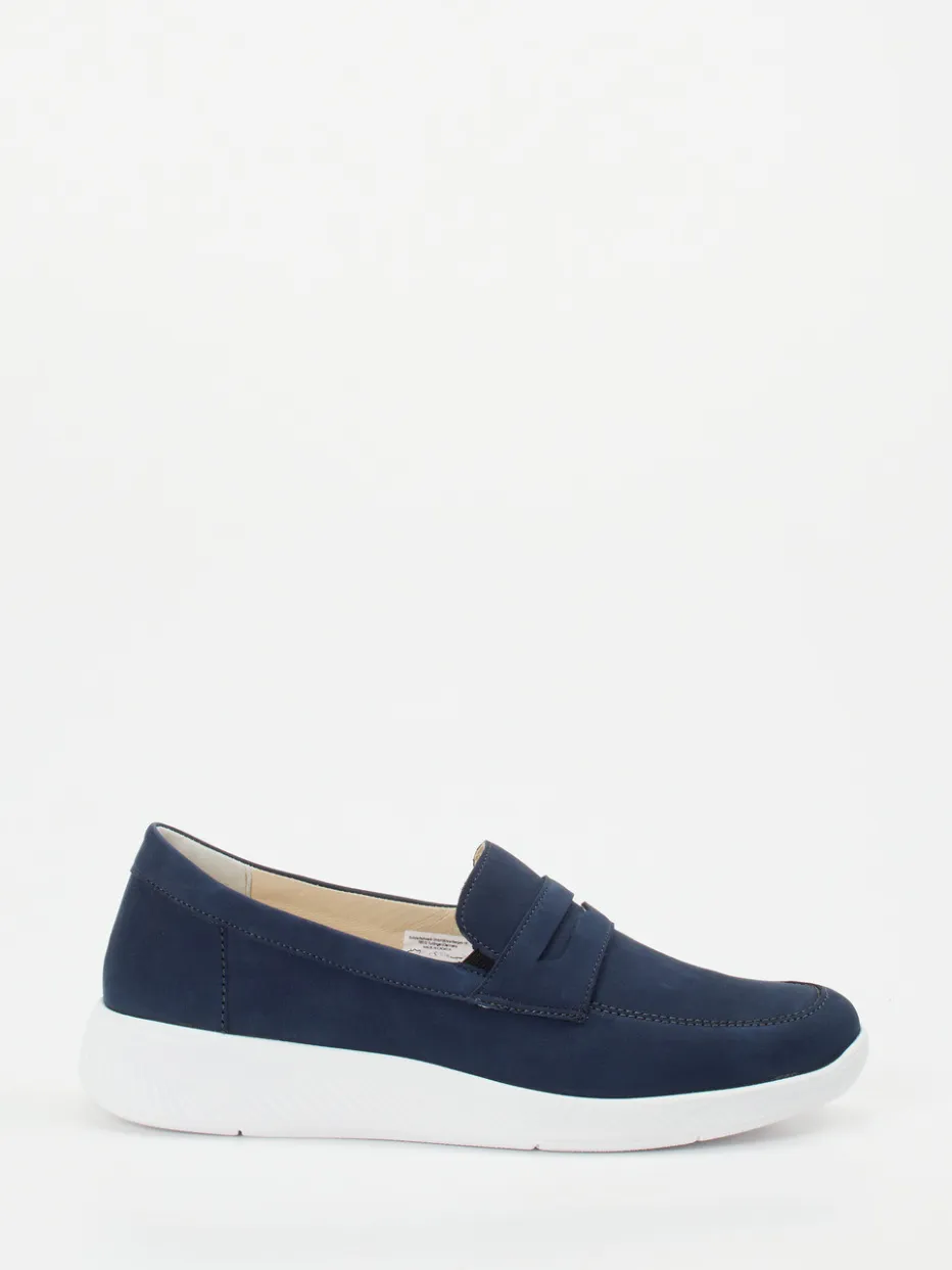 Marineblauer Komfort für entspannte Stunden.Solidus präsentiert mit diesem Damen-Slipper ein Modell, das modisches Understatement und funktionale Leichtigkeit vereint. Der bequeme Loafer aus samtig angeschliffenem Nubukleder in Marineblau überzeugt durch seine klassische, flache Silhouette und eine flexible Passform mit elastischem Einstieg. Die weiße Laufsohle aus PU sorgt für stoßdämpfenden Komfort und einen modernen Kontrast, während die gepolsterte, lederbezogene Memo-Einlegesohle aus Kork auch gegen eigene Einlagen getauscht werden kann. Weite K unterstützt zusätzlich ein komfortables Tragegefühl im Alltag. Kombinierbar mit Stretch-Jeans und lässigem Strick. Solidus steht bei diesem Modell für Komfort mit dezenter Eleganz und aktueller Soft-Loafer-Ästhetik.