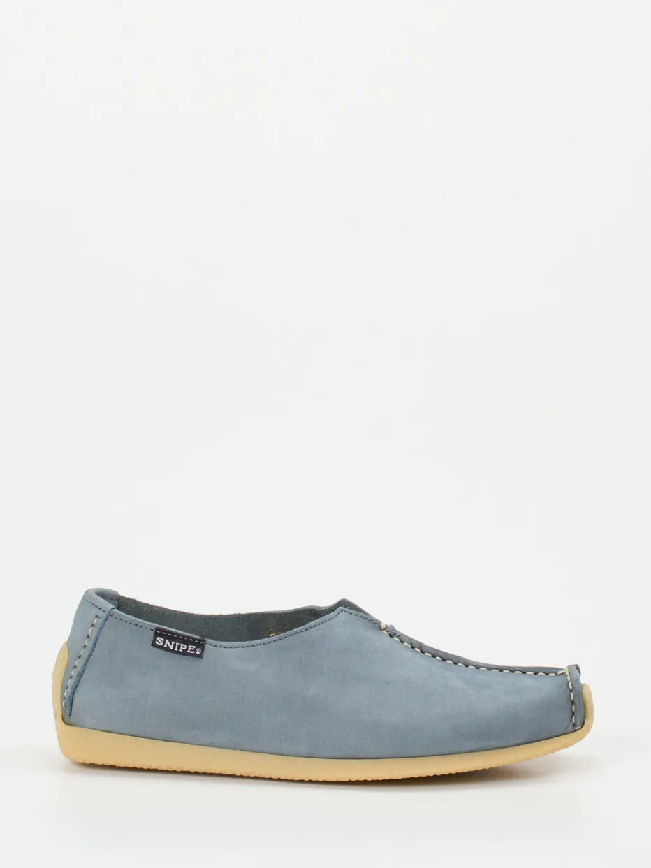 Urbaner Komfort in gedecktem Stil.Der Damenslipper von Snipe überzeugt als alltagstaugliches Freizeitmodell mit unaufdringlichem Design. Für entspannte Wege zwischen Stadtcafé und Zuhause bietet das Modell durch softes Nubukleder mit samtiger Oberfläche ein angenehm natürliches Tragegefühl. Der taubenblaue Farbton setzt in Kombination mit beige abgesetzten Kontrastnähten dezente Akzente im minimalistischen Stilbild. Eine flache Silhouette und Schlupfdesign erleichtern das Anziehen, während die flexible, vanillefarbene Gummisohle sicher abrollt. Inspiriert von „Quiet Luxury“ passt der Schuh ideal zu Casualwear wie Canvas-Hosen. Snipe steht für Funktionalität mit urbaner Leichtigkeit.