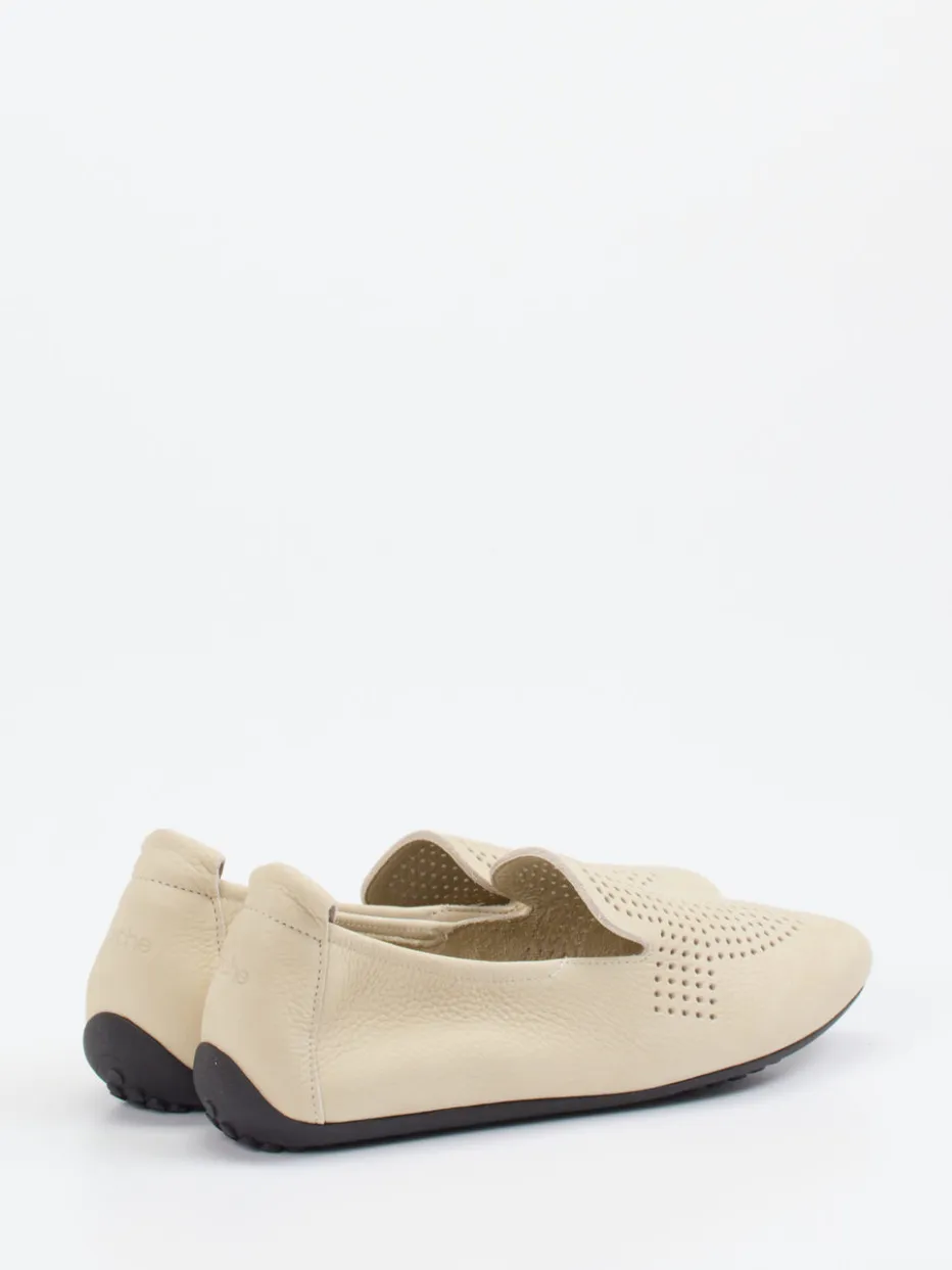 Eleganz und Komfort für warme Tage.Die französische Marke Arche präsentiert einen Damen-Slipper aus hochwertigem Nubukleder. Ideal für entspannte Spaziergänge bei sommerlichen Temperaturen: Das feine Nubukleder ist samtig angeschliffen und begeistert durch seine genarbte Struktur. In dezentem Cremebeige gehalten, zeigt sich der Loafer mit einem feinen Lochmuster und flach zulaufender Silhouette. Die schwarze Naturlatexsohle mit Noppenstruktur steht für hohe Flexibilität und Rutschfestigkeit, während der elastische Einstieg einfaches Hineinschlüpfen ermöglicht. Minimalistische Nahtführung und dezente Prägung an der Ferse runden das elegante Design ab. Besonders angenehm: Das ungefütterte Modell kann auch barfuß getragen werden. Ein zeitloses Modell – komfortbetont interpretiert mit typisch französischer Leichtigkeit.