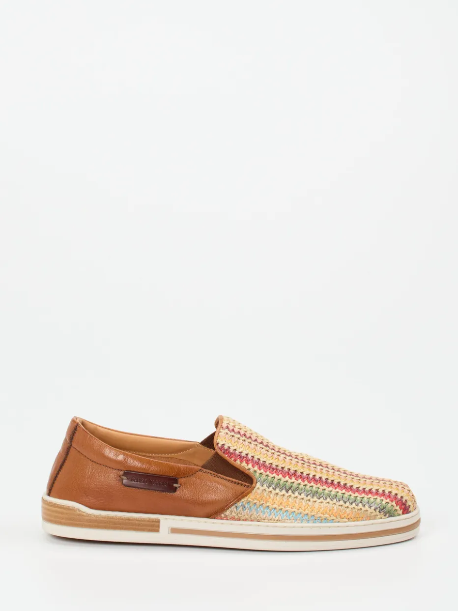 Sommerlicher Komfort mit handwerklichem Charme.Galizio Torresi präsentiert mit diesem Herren-Slipper ein Modell für stilvolle Sommertage. Das mehrfarbig gestreifte Textilmaterial in geflochtener Bastoptik setzt lebendige Akzente und punktet zugleich mit atmungsaktiver Leichtigkeit. Cognacfarbenes Kalbleder ergänzt den Look auf dem hinteren Schaftbereich und sorgt in Kombination mit seitlichen Elastikeinsätzen für angenehmen Tragekomfort. Die flache Silhouette in Schlupfform wird durch eine zweifarbige Gummisohle mit Zierstreifen und griffiger Struktur abgerundet. Mediterrane Einflüsse und Boho-Akzente machen den Slipper zum idealen Begleiter für Urlaub und Freizeit. Optimal kombinierbar mit Leinenhosen oder leichten Hemden. Ein handgefertigt anmutendes Modell für den modisch-entspannten Auftritt.