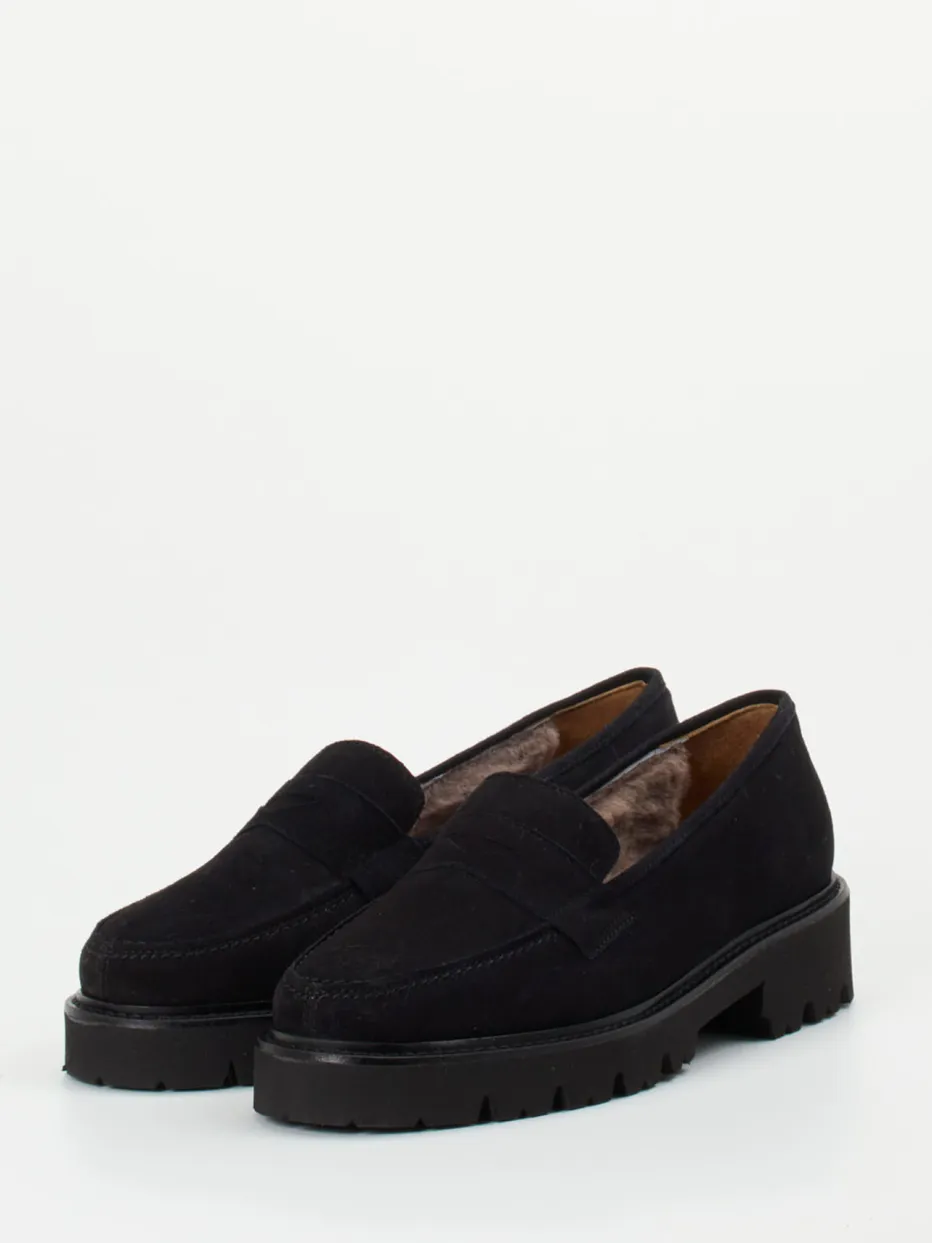 Minimalismus trifft auf warmen Komfort.Der Damen-Slipper von Mannori entfaltet schlichte Eleganz mit funktionalem Anspruch. Für stilbewusste City-Looks an kühlen Tagen bietet dieser Loafer Wärme und Struktur. Gefertigt aus samtig schwarzem Veloursleder, verbindet er fein abgestimmte Ton-in-Ton-Nähte mit einer klassischen Silhouette samt Penny-Loafer-Detail. Ein Innenfutter aus luxuriösem Lammfell sorgt für wohlige Wärme, während die leichte, chunky profilierte Leichtzellsohle sicheren Halt garantiert. Das zurückhaltende Design in Uni-Schwarz verankert sich im „Quiet Luxury“-Trend und passt ideal zu Oversized-Mänteln oder Anzughosen. Ein hochwertig verarbeiteter Allrounder mit modischem Anspruch und sinnvollem Komfort für Herbst und Winter.