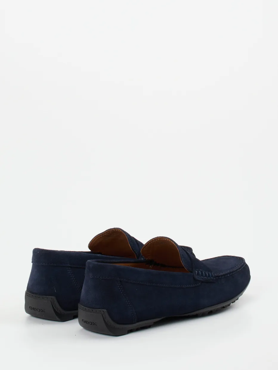 Schlichte Klasse, modern interpretiert.Geox präsentiert einen klassischen Herren-Slipper in Mokassin-Optik. Der elegant flache Penny Loafer aus dunkelblauem Veloursleder, samtig matt strukturiert, überzeugt mit klaren Linien und dezenten Mokassin-Nähten. Die Ton-in-Ton-Nähte und das geprägte Logo an der Ferse betonen den minimalistischen Charakter. Dank atmungsaktiver Geox Respira-Sohle mit griffigem Profil eignet er sich ideal für längere Office-Tage oder gehobene Freizeit-Anlässe. Der Schlupfschuh bietet durch das Lederfutter angenehmen Tragekomfort. Eine stilvolle Wahl im Zeichen von Quiet Luxury. Geox verbindet Komfort mit moderner Zurückhaltung – für souveränen Auftritt zu jeder Gelegenheit.