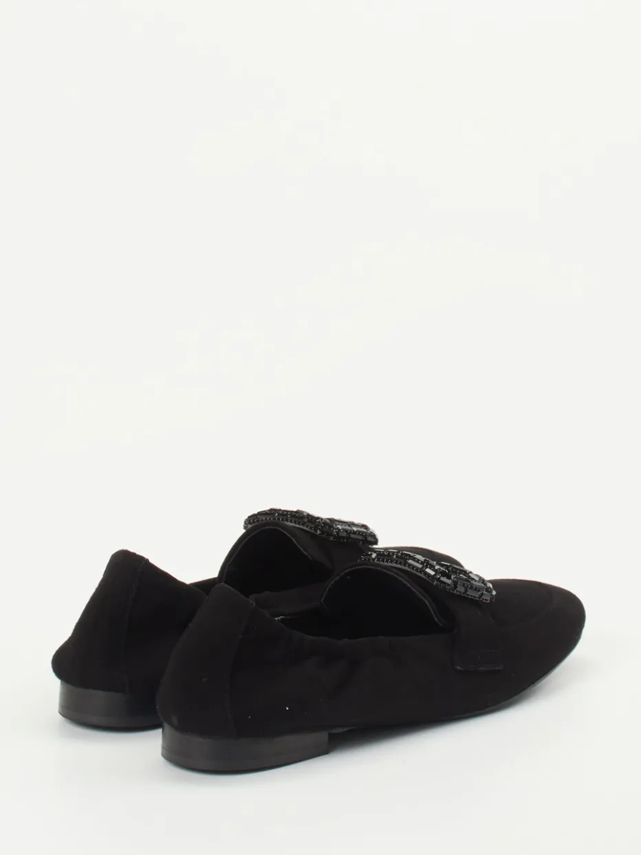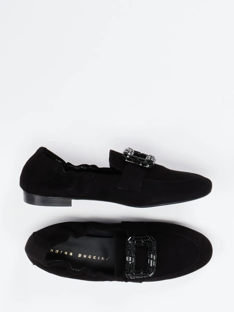 Elegant interpretierter Klassiker.Andrea Puccini zeigt mit diesem Damen-Slipper eine stilvolle Variante für Alltag, Büro und festliche Anlässe. Wenn Understatement auf edlen Glamour trifft, entsteht ein Modell wie dieser schwarze Slipper aus handschuhweichem Veloursleder, ergänzt um einen matt gearbeiteten Look. Die schmal zulaufende Silhouette betont die feminine Linie, während die schwarze, glitzernde Zierschnalle auf dem Blatt zum kunstvollen Fokus wird. Der elastische Einstieg sorgt für angenehmen Tragekomfort, die flache Gummisohle für Alltagstauglichkeit. Inspiriert von Vintage-Designs der 90er, fügt sich der Look perfekt in den Trend „Quiet Luxury“ ein. Kombiniert mit Stoffhose oder Abendoutfit wirkt der Schuh besonders stilsicher. Ein Statement für dezente Eleganz mit detailverliebter Finissage.