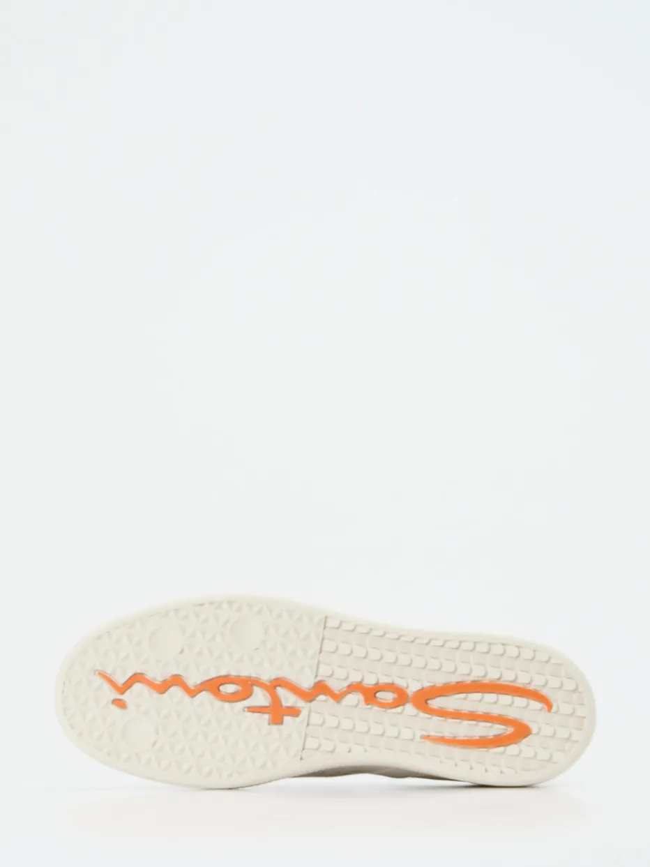 Understatement mit Luxus-Finish.Der Santoni-Sneaker ist ein modisch-klassischer Low-Top für stilbewusste Alltagsmomente. In feinem, genarbtem Elchleder in Off-White gefertigt, überzeugt das Modell mit einem klaren Linienverlauf, goldfarbenem Logo und dezenter Silhouette. Die orangefarbene Gummisohle mit Markenakzent greift Elemente der 90er-Ästhetik auf und verleiht dem Sneaker eine sportlich-moderne Note. Gepaart mit komfortabler Lederinnensohle und Schnürverschluss wird er zum Allrounder für Urban Looks, smarte Casual-Outfits oder Büro-Ensembles. Italienisches Handwerk trifft auf zeitlose Eleganz im Zeichen des „Quiet Luxury“.