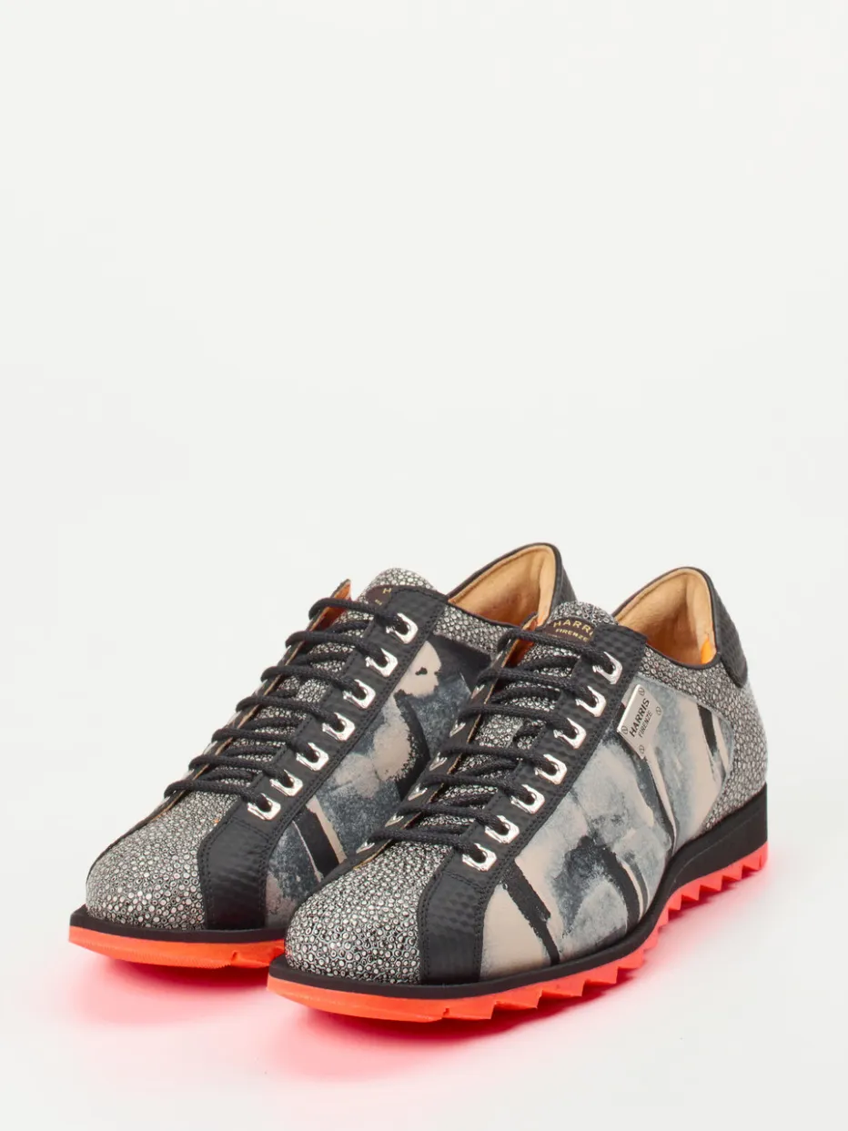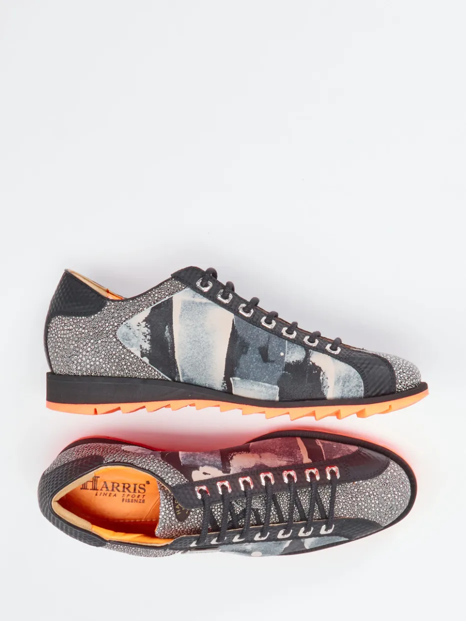 Grafik trifft Streetstyle.Dieser Herren-Sneaker von Harris vereint markantes Design mit modischer Ausdruckskraft. Ideal für den urbanen Alltag, kombiniert das Modell geprägtes Leder mit grafischem Print, ergänzt durch eine strukturierte Textur aus Textil und Details aus Metall. Der anthrazitfarbene Grundton des Obermaterials kontrastiert auffällig mit einer signalorangenen Profilsohle, deren Haifischstruktur nicht nur Stil-, sondern auch Performance-Aspekte abdeckt. Die schmale Silhouette, Metallösen sowie die Brandplate runden den expressiven Look ab. Perfekt zu schwarzen Slim-Fit-Jeans und Bomberjacke für einen trendstarken Auftritt. Hochwertige Materialien und kunstvolle Gestaltung verbinden sich zu modischer Individualität made by Harris.