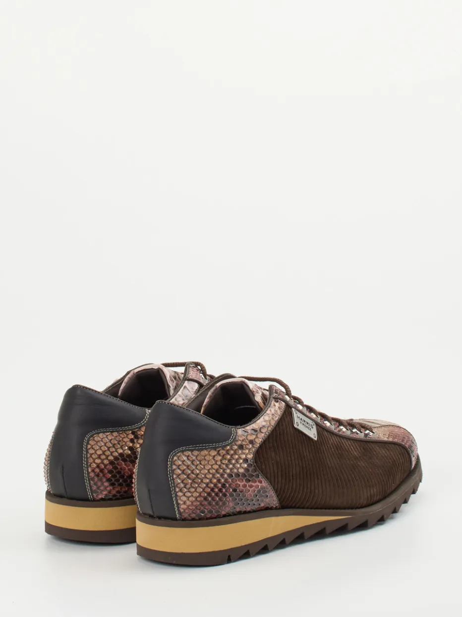 Extravaganter Look für urbane Ausgeh-Momente.Harris interpretiert den klassischen Low-Top Sneaker neu: Das Herrenmodell besticht durch einen exklusiven Materialmix aus geprägtem Leder mit Schlangenoptik, samtigem Velours und Glattleder. Dunkelbraune Grundtöne treffen auf beigebraune Kontrastelemente – ergänzt von einer auffälligen Kontrastsohle mit Zickzack-Profil. Die sportlich-flache Silhouette mit Schnürung und seitlicher Metall-Logo-Plakette verleiht urbanen Outfits eine stilvolle Note. Inspiriert von Streetwear mit Vintage-Flair, ist er ideal für alltagsnahe City-Looks mit modischem Anspruch. Italienische Verarbeitung in luxuriöser Umsetzung – für höchste Ansprüche in Design und Komfort.