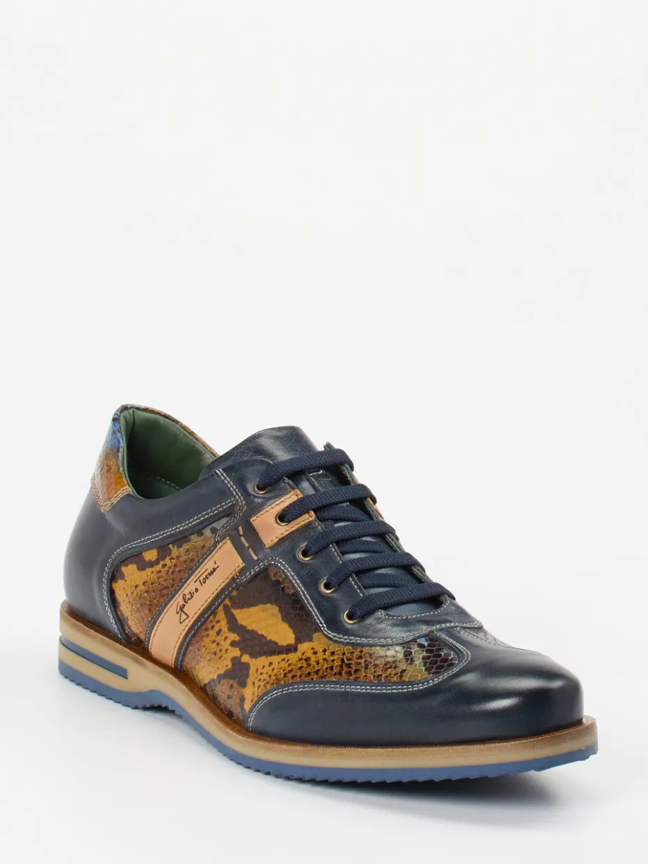 Charakterstark in Farbe und Struktur.Galizio Torresi interpretiert den klassischen Herren-Sneaker stilvoll neu. Ideal für urbane Alltagsmomente und abendliche Ausgeh-Looks verbindet er geprägtes Leder mit glattem Kalbsleder in edlem Dunkelblau, Cognac und Curry. Die glänzende Oberfläche, Schlangenprägung und goldfarbene Logoakzente unterstreichen den expressiven Stil. Ein waldgrünes Innenfutter aus Kalbleder, messingfarbene Ösen und die durchgenähte Gummisohle stehen für italienische Handwerkskunst mit funktionalem Komfort. Kombiniert mit Jeans oder Lederjacke ein perfekter Fashion-Impuls. Ein Design, das Formgefühl und Individualität vereint – made by Galizio Torresi.