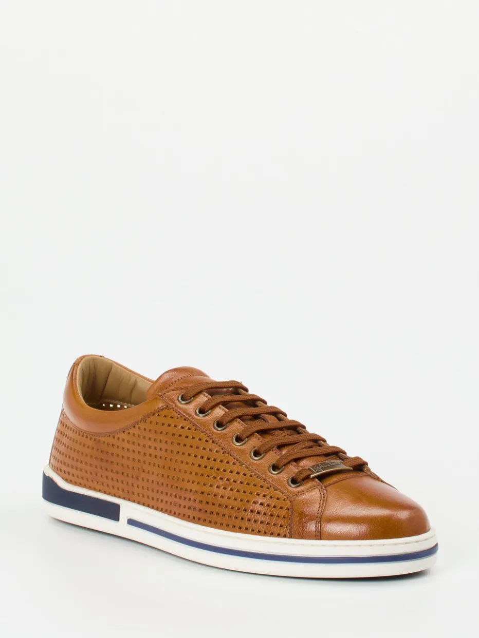 Business-Charme trifft Sommerfrische.Galizio Torresi präsentiert mit diesem Herren-Sneaker ein Modell, das stilvolle Leichtigkeit mit klassischer Linienführung vereint. Ideal für wärmere Tage im urbanen Umfeld bietet das cognacfarbene Glattleder mit samtiger Prägung und Lochmuster nicht nur edle Optik, sondern auch angenehme Atmungsaktivität. Die klassische, niedrig geschnittene Silhouette wird durch die zweifarbige Gummisohle mit marineblauem Kontraststreifen und Metall-Branding auf der Lasche akzentuiert. Lederfütterung und gepolstertes Wechselfußbett garantieren ganztägigen Tragekomfort. Minimalistisch im Gesamtbild fügt sich der Schuh perfekt in smarte Freizeit- oder Büro-Outfits ein. Ein Ledersneaker mit italienischem Anspruch an Stil und Qualität.