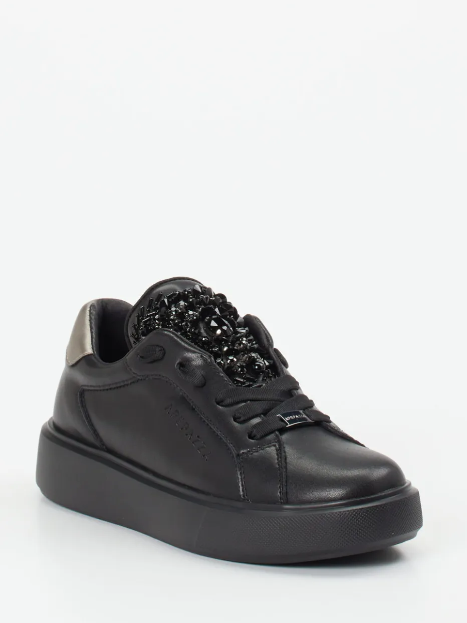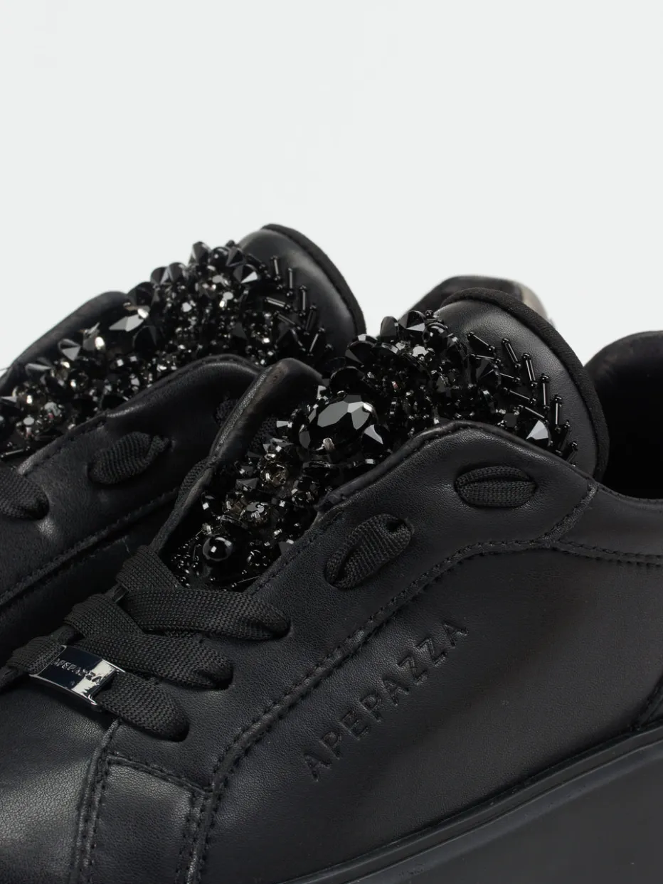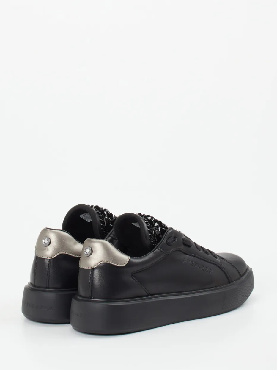 Glamour trifft Alltagstauglichkeit.Apepazza präsentiert einen Low-Top-Sneaker für Damen, der modischen Anspruch mit Komfort vereint. Ob Citybummel oder Abend-Event – der schwarze Sneaker aus mattem Glattleder überzeugt mit einem markentypisch extravaganten Design. Die Zunge ist reich mit tonigen Schmucksteinen in vielfältigen Schliffen besetzt, während ein silberner Metallic-Patch die Ferse akzentuiert. Die voluminöse Gummisohle mit Zickzack-Profil sichert Trittfestigkeit, das lederbezogene Fußbett sorgt für Tragekomfort. Durch die klare Linienführung wirkt der Look reduziert und zugleich modern – ein Paradebeispiel für Embellished Minimalism. Apepazza verbindet italienische Designkunst mit urbaner Eleganz.