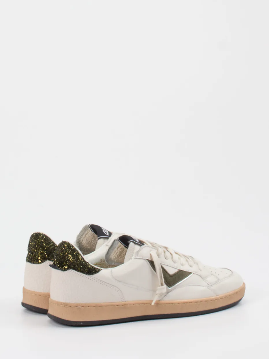 Italienisches Retro-Design trifft auf Glitzerbesatz.Der 4B12 Sneaker interpretiert klassische Low-Top-Silhouetten neu. Ideal für urbane Streifzüge oder entspannte Ausgehmomente vereint dieser Schuh fein gearbeitetes Hirschleder mit samtigen Veloursleder-Akzenten an den Seiten. Der offwhite-farbene Grundton wird durch eine beige-schwarze Farbgebung und einen raffinierten Glitzerbesatz an der Ferse ergänzt. Die profilierte Gummisohle bietet rutschfesten Komfort, während perforierte Details und ein sichtbares 4B12-Logo sportive Akzente setzen. In der aktuellen „Retro Court Sneaker Revival“-Welle ist dieses Modell ein subtiler Blickfang für trendorientierte Casual-Styles. Authentisch verarbeitet mit italienischer Designprägung – 4B12 steht für Qualität mit moderner Fashion-Ausrichtung.