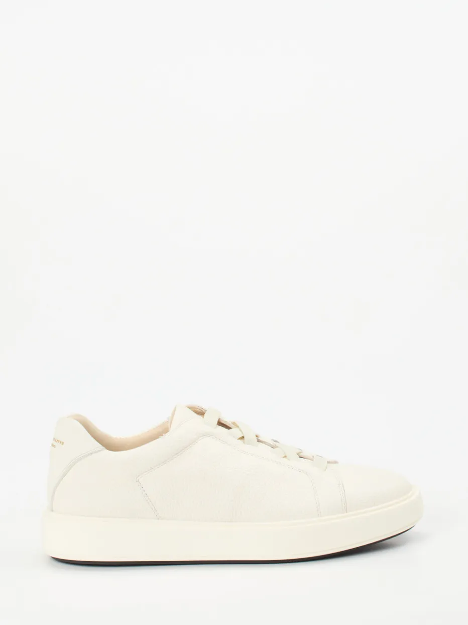 Design trifft Komfort in stilvoller Form.Officine Creative präsentiert mit diesem Low-Top-Sneaker ein Modell für Alltag und Business Casual. Die Basis bildet edles Kalbleder, dessen genarbte Struktur in sanftem Cremeweiß zur Geltung kommt. Die klassische Silhouette mit abgerundeter Zehenpartie erhält durch feine Doppelsteppnähte und goldfarbene Logoprints stilvolle Akzente. Die elastischen Einsätze ersetzen klassische Schnürsenkel und bieten sicheren Halt. Eine rutschhemmende Gummisohle und ein gepolstertes Wechselfußbett unterstreichen den hohen Tragekomfort. Modisch eingeordnet im „Quiet Luxury“-Trend überzeugt das Modell im cleanen Streetwear-Kontext. Ein zeitloses Design mit dezent luxuriöser Ausstrahlung – typisch Officine Creative.