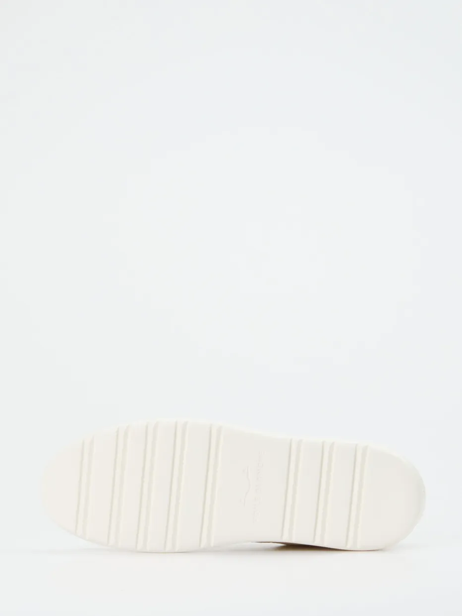 Voile Blanche interpretiert den klassischen Low-Top-Sneaker neu. Für urbane Pendelwege oder clean gehaltene Freizeitlooks bietet dieses Modell eine stilvolle Lösung. Gefertigt aus genarbtem Kalbleder in edlem Cremeweiß, zeigt sich das Design puristisch mit Ton-in-Ton-Nähten, strukturierter Oberfläche und geprägtem Seitenlogo. Eine gepolsterte Schaftrandzone sowie die rutschhemmende Gummisohle stärken Tragekomfort und Alltagstauglichkeit. Stilistisch bewegt sich der Schuh zwischen Quiet Luxury und monochromer Leichtigkeit der Saison. Besonders wirkungsvoll mit beigem Trenchcoat oder heller Canvas-Tasche kombinierbar. Ein dezentes Statement für moderne Zurückhaltung – mit Komfort und Klasse.