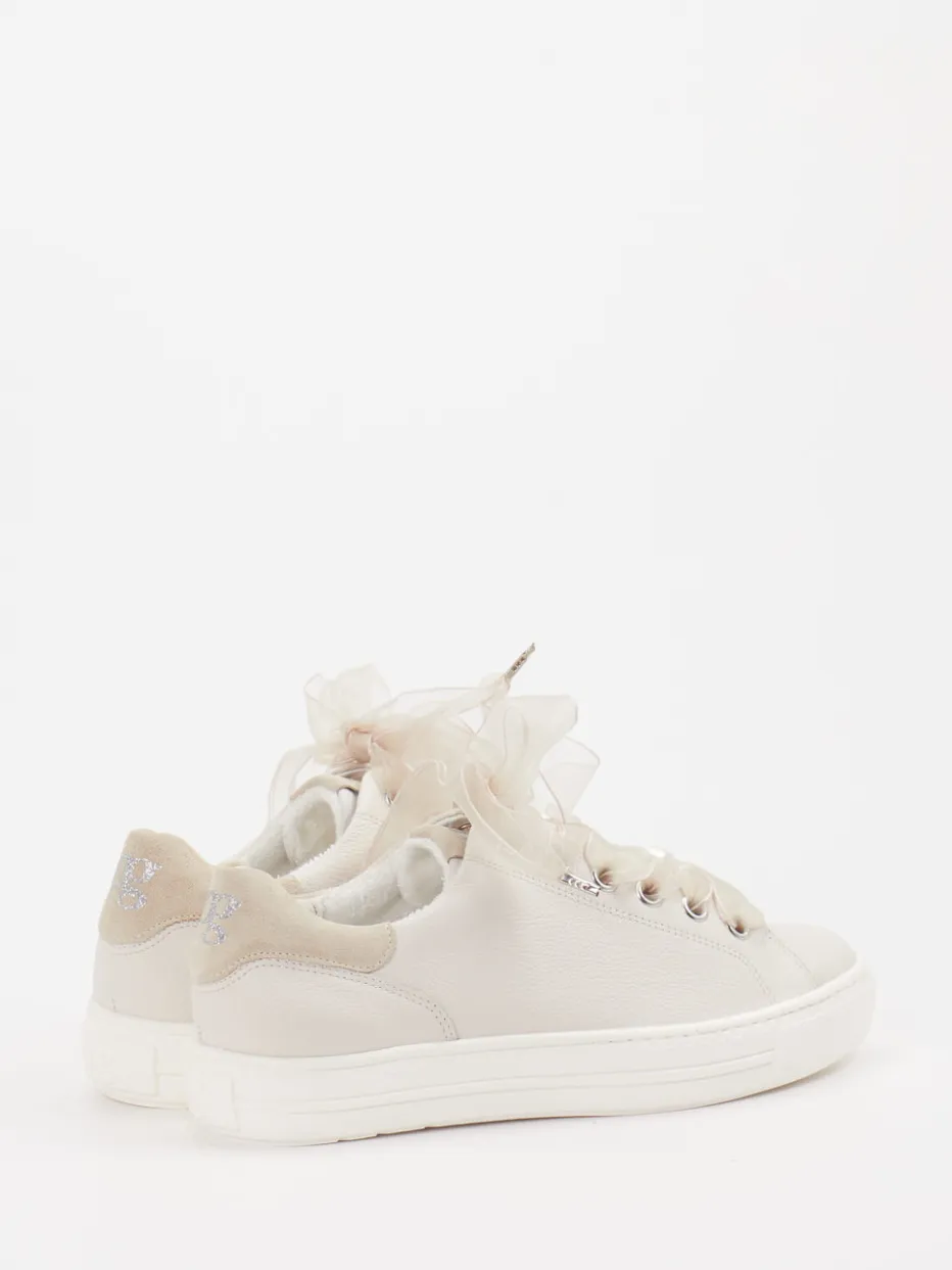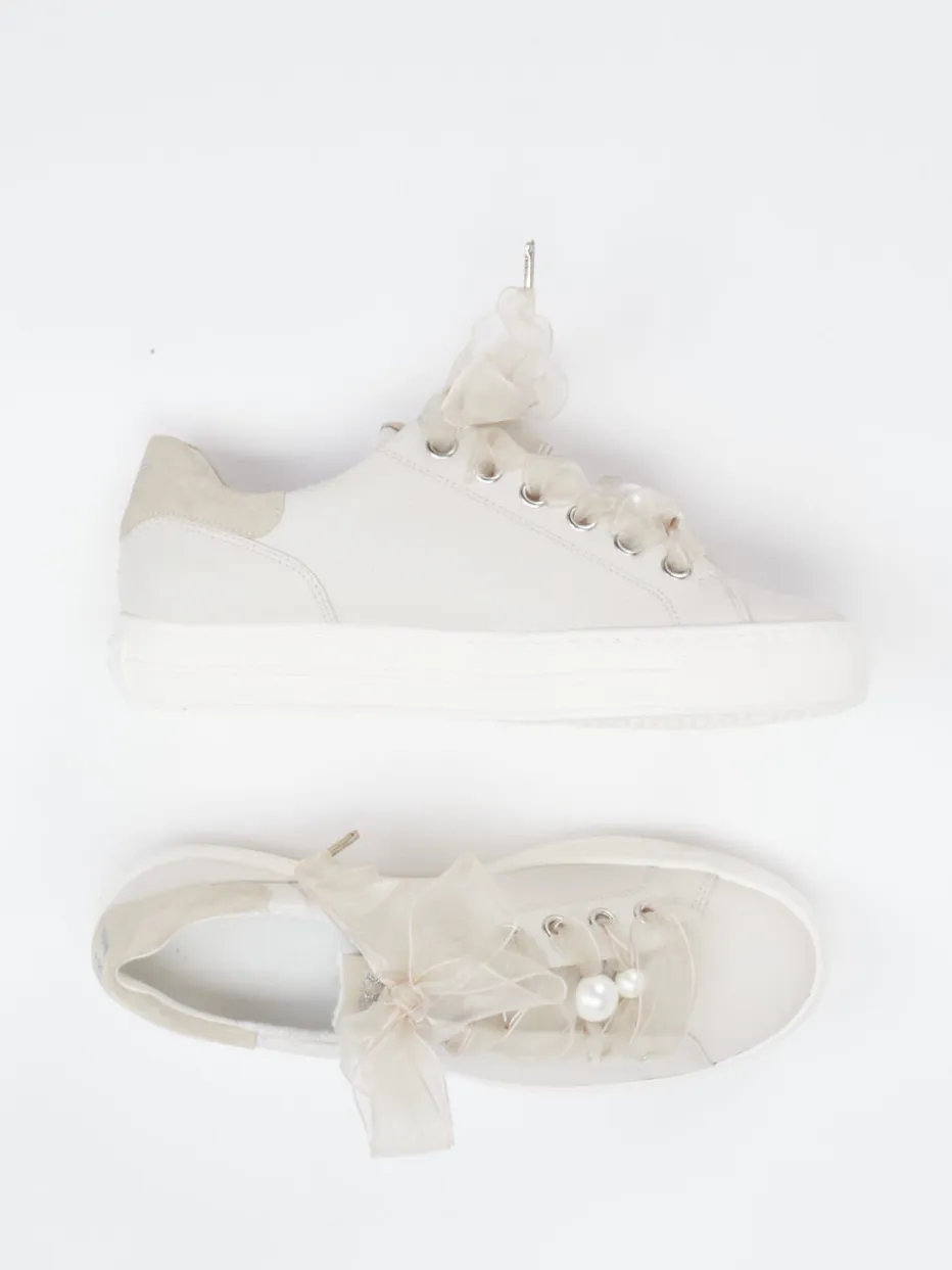 Dieser Paul Green Sneaker verbindet sanftes Kalbleder mit verspielten Details wie einer Satin-Schnürung und Perlenverzierung – perfekt für feminine Casual Styles mit besonderem Akzent.
