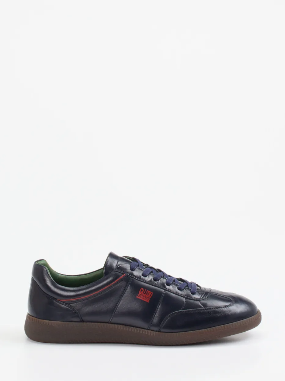 Italienisches Design mit Retro-Charme.Galizio Torresi interpretiert den klassischen Herren-Sneaker neu – mit hochwertigen Materialien und stilvollem Understatement. Ideal für entspannte Tage in der Stadt überzeugt dieses Modell mit dunkelblauem Kalbleder, das samtig glänzt und butterweich in der Haptik ist. Rote Paspelierungen und ein grünes Innenfutter setzen ebenso dezente wie markante Farbakzente. Die sportliche Silhouette mit flacher Schnürung und profilierter Gummisohle unterstreicht den Vintage-Charakter mit moderner Streetwear-Attitüde. Perfekt zu lässigem Denim oder Chino. Ein entspannter Premium-Look für stilvolle Auftritte mit Komfortanspruch.