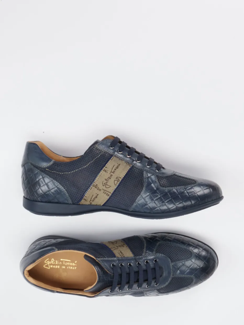 Textur trifft Eleganz. Galizio Torresi präsentiert einen Sneaker für Herren in charaktervoller Gestaltung. Perfekt für gepflegte Alltagsmomente mit stilistischer Aussage überzeugt dieses Modell mit seinem hochwertigen Kalbleder, das durch genarbte Oberflächen und glänzende Kroko-Prägungen veredelt wird. Dunkelblaue Grundtöne werden von beigen Akzenten und einem grafisch designten Textilstreifen harmonisch ergänzt. Die flache Silhouette und die perforierten Details sorgen für einen sportiv-eleganten Auftritt mit stillem Luxus-Charakter. Mit Schnürverschluss und gummierter Laufsohle eignet sich der Schuh für smarte Streetwear wie für den gehobenen Büro-Look. Ein Entwurf, der italienische Handwerkskunst und trendbewusste Formsprache verbindet.