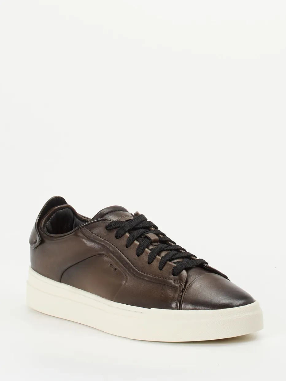 Business-Casual-Sneaker mit urbanem Charme.Die Marke Santoni präsentiert diesen Sneaker für Herren als minimalistisches Highlight. Optimal für Tage, an denen Komfort und stilvolle Lässigkeit gleichermaßen gefragt sind. Das fein glänzende Kalbleder in Dunkelbraun verleiht dem Low-Top-Modell eine edle Erscheinung, während das gepolsterte Lederinnenfutter für angenehmen Tragekomfort sorgt. Details wie die schwarze Schnürung und die Off-White-Gummisohle mit orangefarbenem Branding ergänzen den klaren Look. Dank der flachen Silhouette passt der Schuh sowohl zu Bürokleidung als auch zu gehobenen Alltags-Outfits. Elemente aus der Quiet Luxury-Ästhetik spiegeln aktuelle Streetwear-Trends wider. Hochwertiges Handwerk trifft stilistische Variabilität aus dem Hause Santoni.
