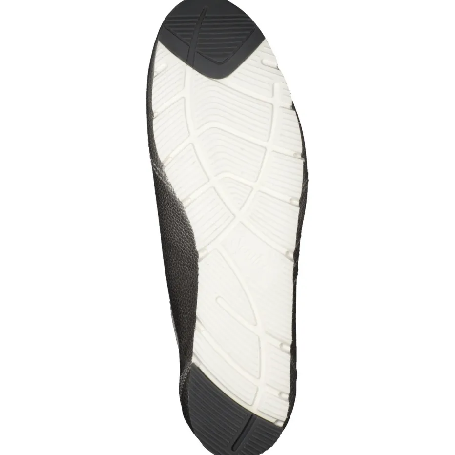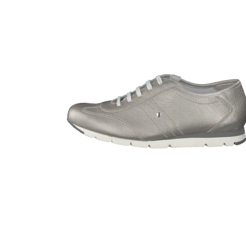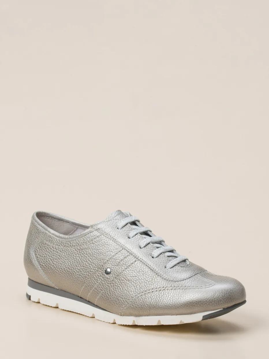 Ideal für einen aktiven Büroalltag oder entspannte City-Walks bietet das Modell aus silberfarbenem, metallisch glänzendem Kalbleder mit genarbter Oberfläche und flacher, schmaler Silhouette eine stilvolle Lösung. Die profilierte Luftpolstersohle in Weiß und Dunkelgrau sorgt für Stabilität und Komfort, das Innenfutter aus Leder und das herausnehmbare Fußbett bieten zusätzlichen Mehrwert. Filigrane Details wie silberfarbene Öse und Seitenemblem verleihen dem minimalistischen Design Tiefe. Trendig durch Metallic-Highlights – passend zu hellen Jeans oder eleganten Hosen.