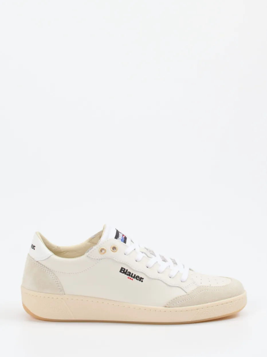 Retro-Court-Stil neu interpretiert.Blauer präsentiert einen klassischen Low-Top-Sneaker für entspannte Alltagsmomente. Das Modell kombiniert weißes Kalbleder mit samtigem Veloursleder in Beige und überzeugt durch strukturgebende Elemente wie die perforierte Zehenpartie und goldfarbene Ösen. Eine profilierte Gummisohle mit Wabenstruktur rundet den stilvollen Auftritt ab. Die flache Silhouette in Uni-Optik greift den angesagten Retro-Trend auf und liegt im Kontext von „Quiet Luxury“ voll im Zeitgeist. Der seitlich platzierte Logo-Stick und der Patch auf der Zunge setzen dezente Markenakzente. Idealer Kombipartner zu Hoodie und Cap. Hochwertige Verarbeitung trifft auf minimalistisches Design mit Anspruch.