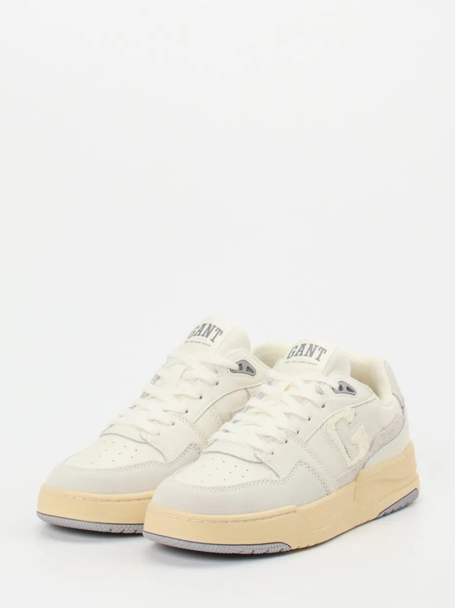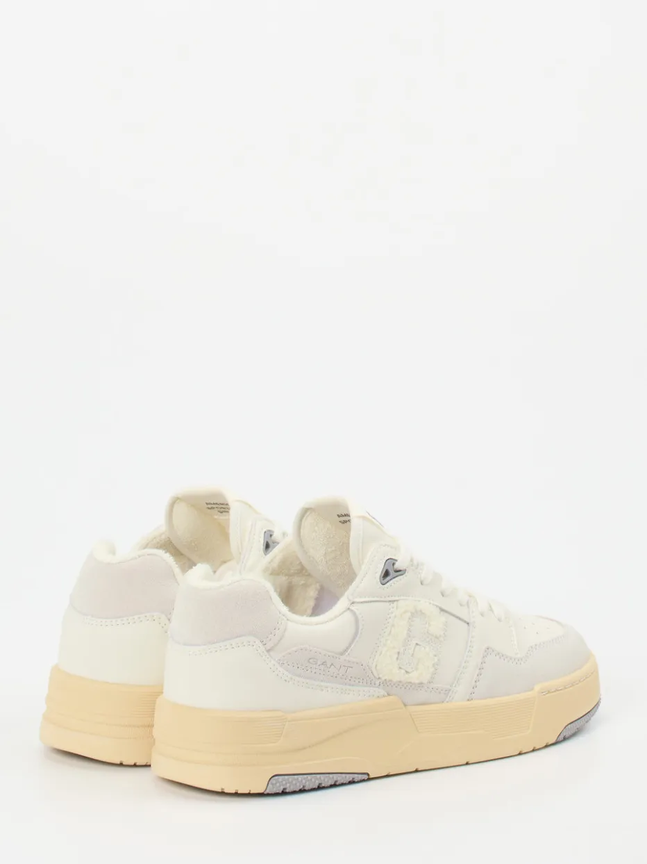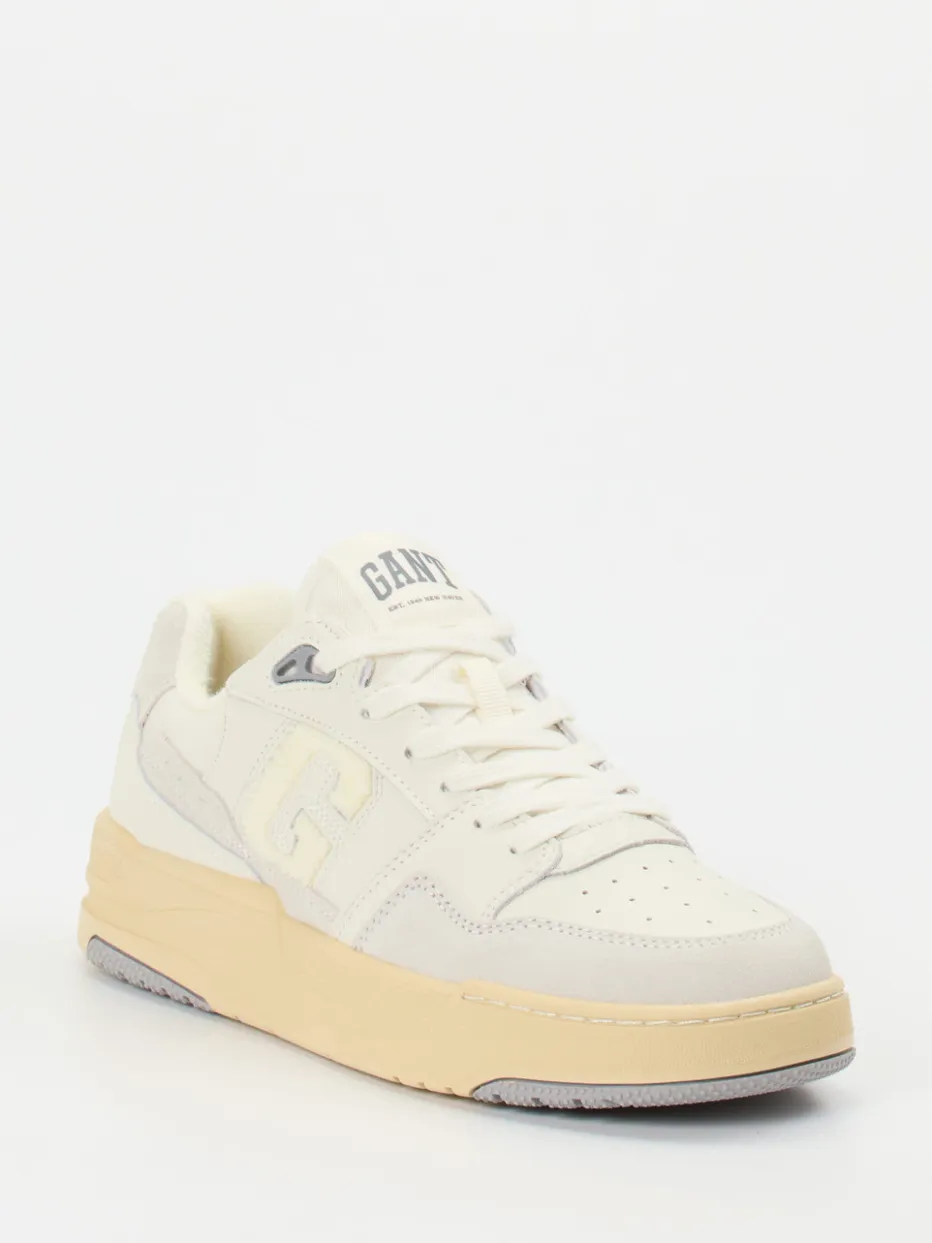Moderner Retro-Look trifft Alltagstauglichkeit.Gant präsentiert diesen Low-Top-Sneaker mit sportivem Charakter. Ideal für entspannte Freizeitmomente bietet das Modell ein hochwertiges Obermaterial aus Kalbleder, ergänzt durch samtiges Veloursleder und strukturgebende Frottee-Panels. Das Design zeigt sich in Cremeweiß mit beigen und hellgrauen Details – abgerundet durch tonale Nähte, Logo-Applikationen und eine zweifarbige Gummisohle mit rutschhemmendem Profil. Das atmungsaktive Innenfutter aus Frottee und Mesh sowie die gepolsterte Ausstattung sorgen für ganztägigen Tragekomfort. Stilistisch schlägt der Sneaker die Brücke zwischen Streetstyle und Retro-Sportswear – passend zu Jogpants oder lockeren Jeans. Gant verbindet Komfort und zeitlosen Stil mit sportlichen Designzitaten.