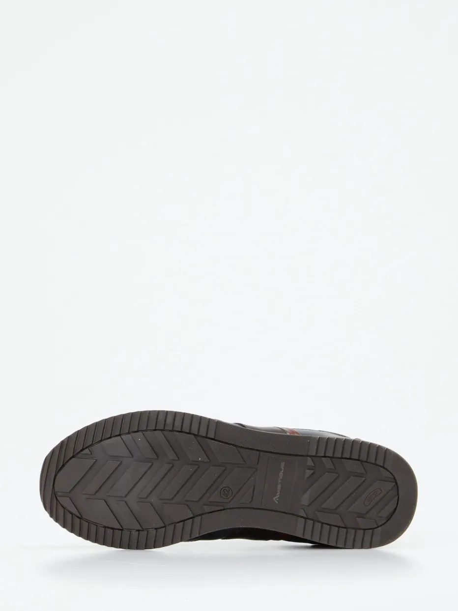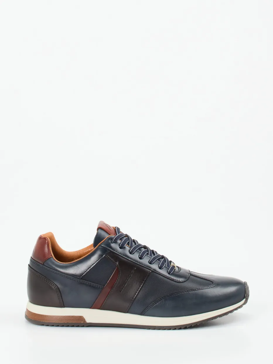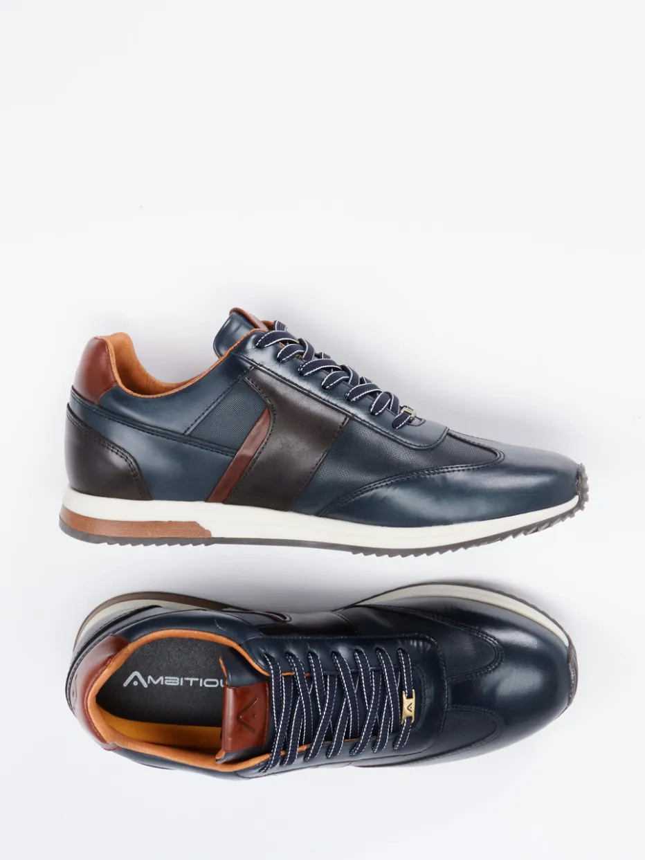 Stilvoll durch Alltag und Büro.Ambitious präsentiert mit diesem Herren-Sneaker ein vielseitiges Low-Top-Modell für stilbewusste Casual-Outfits. Die Kombination aus dunkelblauem Kalbleder mit glänzendem Finish und textilen Akzenten verleiht dem Schuh eine moderne Retro-Note. Kastanienbraune Details an Ferse und Schnürung sowie goldfarbene Ösen runden das dezente Design ab. Die klassische, schmale Silhouette wird durch die Gummisohle und den gepolsterten Einstieg ergänzt. Inspiriert von Streetwear und dem Retro Runner-Trend eignet sich der Schuh gleichermaßen für Freizeit wie Business Casual. Ein Modell mit sportlich-eleganter Ausstrahlung und markentypischer Materialqualität.