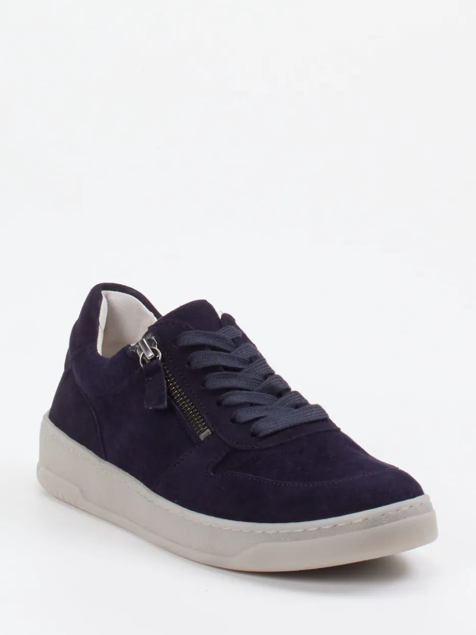 Komfort trifft auf dezente Sportlichkeit.Gabor präsentiert einen Damen-Sneaker, der durch Design und Tragekomfort überzeugt. Ideal für Freizeit und Alltag: Das dunkelblaue Kalbleder zeigt sich samtig matt mit fein gesetzten Ziernähten und sportlicher Perforierung. Die rutschhemmende Gummisohle in Hellgrau und der seitliche Reißverschluss mit Zuglasche ergänzen die klassische Rundform um praktische Details. Das beige Leder-/Textilfutter sowie das herausnehmbare Best-Fitting-Fußbett garantieren ganztägiges Wohlgefühl. Der Look steht im Zeichen von Soft Utility und Everyday Comfort. Ein vielseitiger Qualitätsschuh mit komfortbetonter Silhouette und modischer Leichtigkeit.