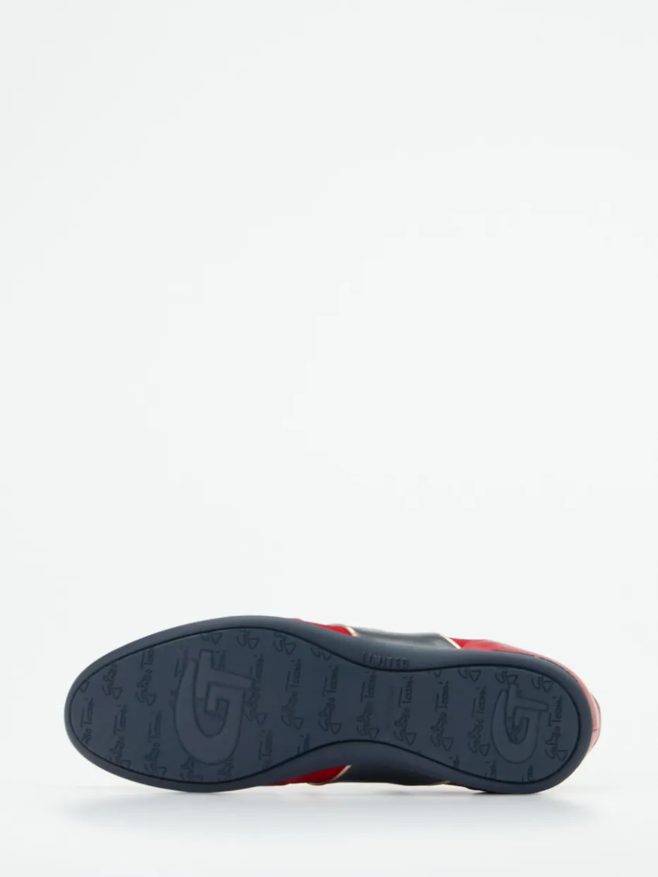 Stilbewusst unterwegs – mit italienischer Raffinesse.Galizio Torresi präsentiert einen Herren-Sneaker, der mutiges Design mit edler Materialwahl verbindet. Für markante Auftritte in Freizeit oder Bar-Abend sorgt die auffällige Farbkombination aus kräftigem Rot mit dunkelblauen Details. Das Zusammenspiel von Kalbleder in glatt schimmernder und velourartiger Textur unterstreicht den luxuriösen Charakter. Akzente in Gold, etwa die Zierplakette auf der Lasche und die seitliche Stickerei, verleihen dem sportlich-geschliffenen Low-Top mit schmal zulaufender Silhouette einen exklusiven Look. Die gepolsterte Innensohle ist herausnehmbar – Komfort auf modernem Niveau. Besonders wirkungsvoll zu dunkelblauen Chinos oder Statement-Jacke. Galizio Torresi vereint italienische Formsprache mit handwerklicher Wertigkeit.