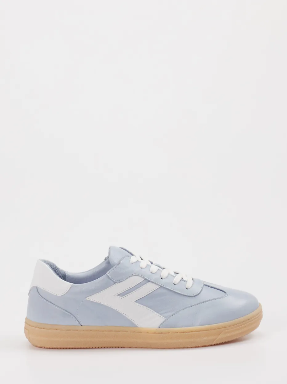 Frischer Pastellakzent für urbane Styles. Andrea Conti präsentiert mit diesem Sneaker ein sportlich-legères Unisex-Modell für Alltag und Freizeit. Gefertigt aus hochwertigem Kalbleder, kombiniert dieser Low-Top Sneaker eine glatte, leicht glänzende Oberfläche mit einem modernen Hellblau. Eine klassische, flache Silhouette wird ergänzt durch weiße Kontrast-Overlays, ein seitliches Logo und eine naturfarbene Gummisohle mit strukturierter Profilierung. Innen überzeugt weiches Lederfutter mit Tragekomfort und Einlagenfreundlichkeit. Die klare Formensprache greift den Retro-Trend auf und passt ideal zu athletisch entspannten Styles. Harmoniert besonders mit hellen Denim- oder Pastelllooks. Ein trendbewusster Alltagsbegleiter mit markentypischer Bequemlichkeit.