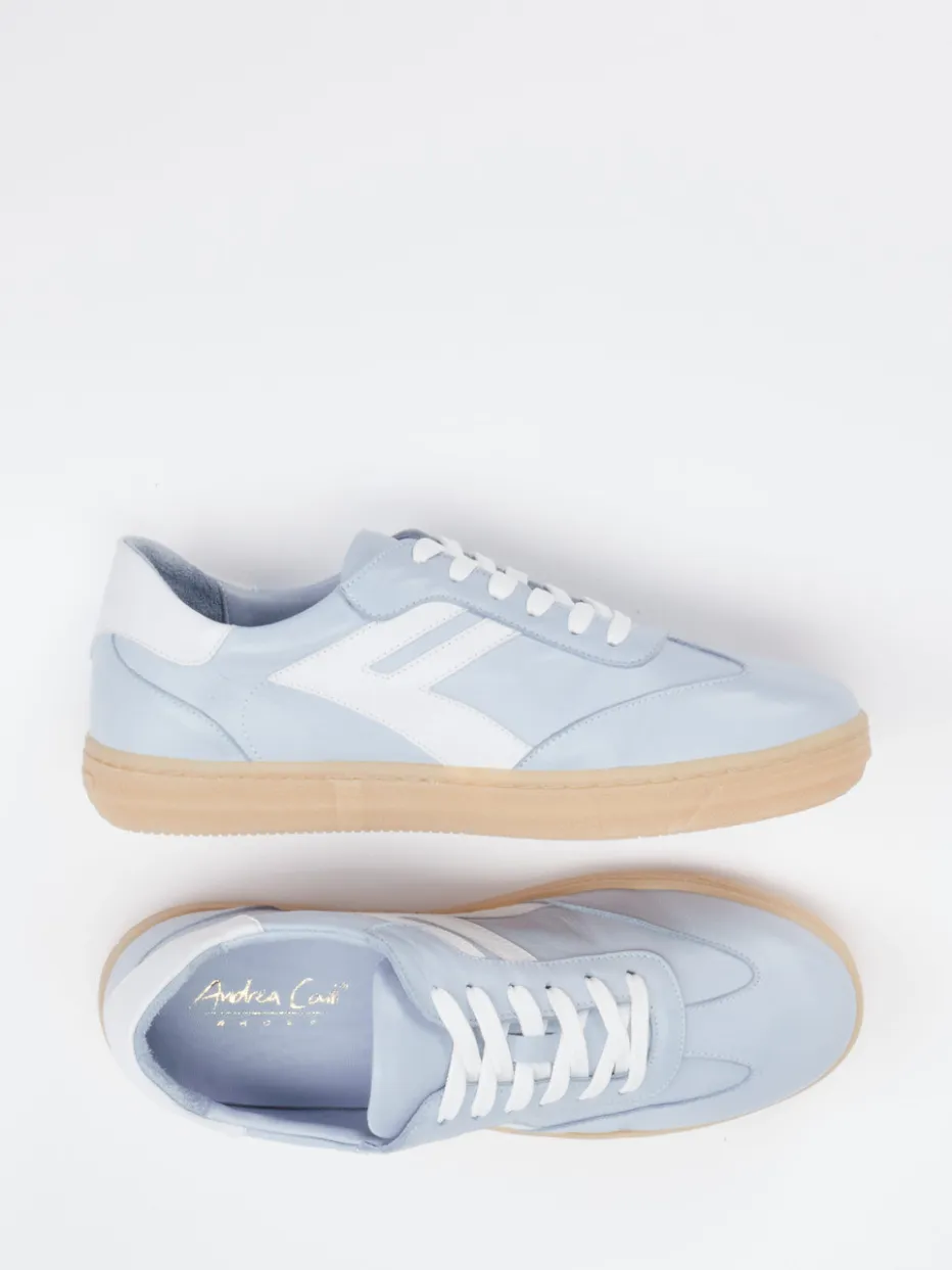 Der retro-inspirierte Sneaker von Andrea Conti vereint weiches Kalbleder mit glänzender Oberfläche und pastelliger Farbgebung – perfekt im aktuellen Streetwear-Kontext.