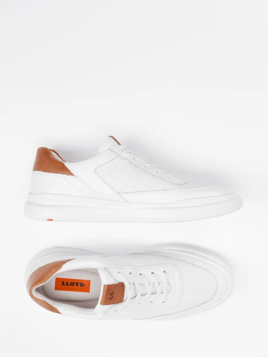 Smarte Leichtigkeit für den Alltag.Lloyd präsentiert einen modernen Herren-Sneaker mit sportiver Note. Ideal für urbane Tagesoutfits bietet das Modell hohen Tragekomfort durch atmungsaktives Textilfutter und Memory-Foam-Fußbett. Gefertigt aus glattem Kalbleder mit mattweißer Oberfläche und cognacfarbenen Akzenten an Ferse und Zunge wirkt der Sneaker clean und stilsicher. Die klassische Silhouette mit Schnürung und kontrastierendem Mesh im Mittelbereich orientiert sich an minimalistischem Streetwear-Design. Dank extraleichter Gummisohle mit griffigem Profil bleibt der Auftritt auch bei längeren Wegen komfortabel. Besonders gut zur Geltung kommt er zu schmalen Chinos oder Ton-in-Ton-Sneaker-Socken. Ein Sneaker für vielseitigen Stil mit klarer Formensprache – typisch Lloyd.