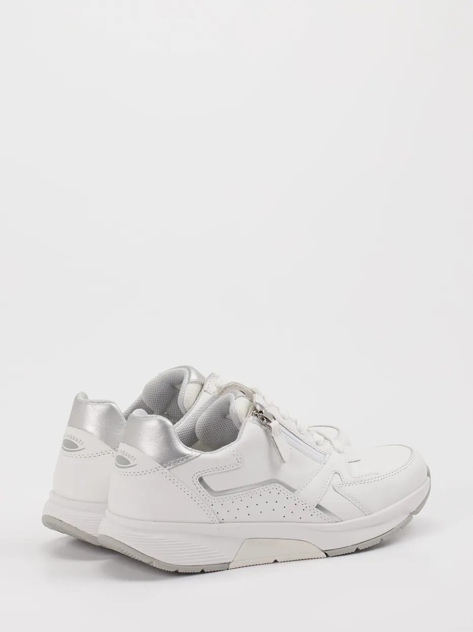 Komfort trifft Alltagstauglichkeit. Gabor Comfort zeigt mit diesem Damen-Sneaker eine gelungene Synthese aus Ästhetik und Funktionalität. Ob beim Stadtbummel oder auf dem Weg ins Büro – dieser Sneaker erfüllt stilbewusste Komfort-Ansprüche. Gefertigt aus hochwertigem Kalbleder, wirkt die glatte Oberfläche in Offwhite besonders edel. Silberfarbene Akzente, eine klassische Silhouette und der seitliche Reißverschluss setzen moderne Akzente. Innen sorgen Mesh-Futter und eine gepolsterte Innensohle für ein angenehmes Tragegefühl. Die rutschhemmende Gummisohle und die Reißverschluss-Schnürung bieten Alltagstauglichkeit mit Stil. Ideal zu cropped Jeans und Funktionsjacke. Markentypischer Komfort mit minimalistischem Chic – für vielseitige Freizeit-Looks.