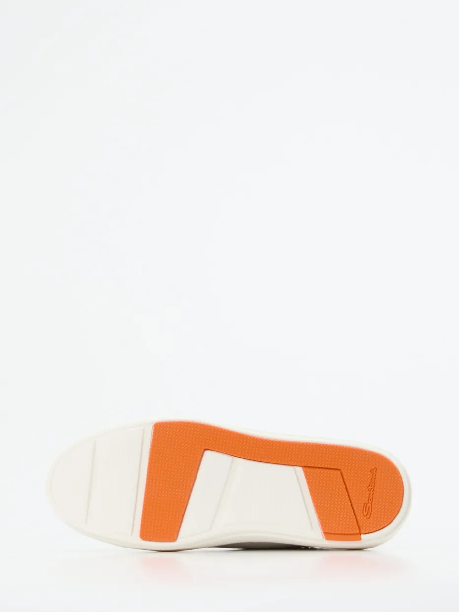 Geradliniger Stil mit farbigem Twist.Die italienische Marke Santoni präsentiert mit diesem Low-Top-Sneaker ein Modell für modebewusste Puristen. Ideal für urbane Alltagsmomente oder einen smart-casual Office-Look: Das fein genarbte Kalbleder in Offwhite bietet mit seinem Ton-in-Ton-Nähten und der klassisch abgerundeten Silhouette eine stilsichere Basis. Die außen orange akzentuierte Gummisohle sorgt für einen subtilen, modischen Akzent mit Streetwear-Anleihen. Innen sorgt ein weiches Kalblederfutter und ein gepolstertes Wechselfußbett für durchgängigen Komfort. Die Kombination aus Understatement und Kontrast schafft ein modernes Premium-Statement im Thema Quiet Luxury.