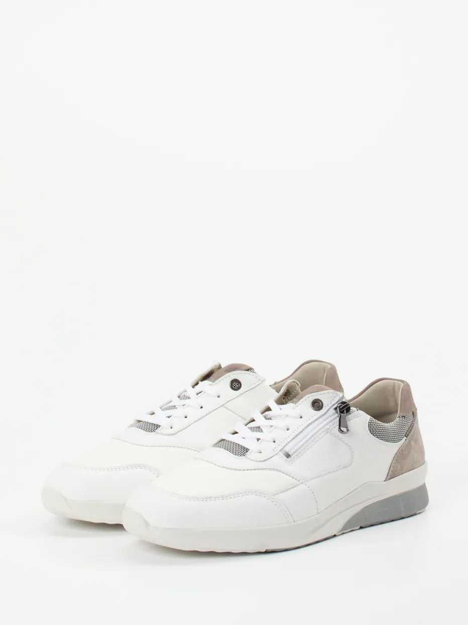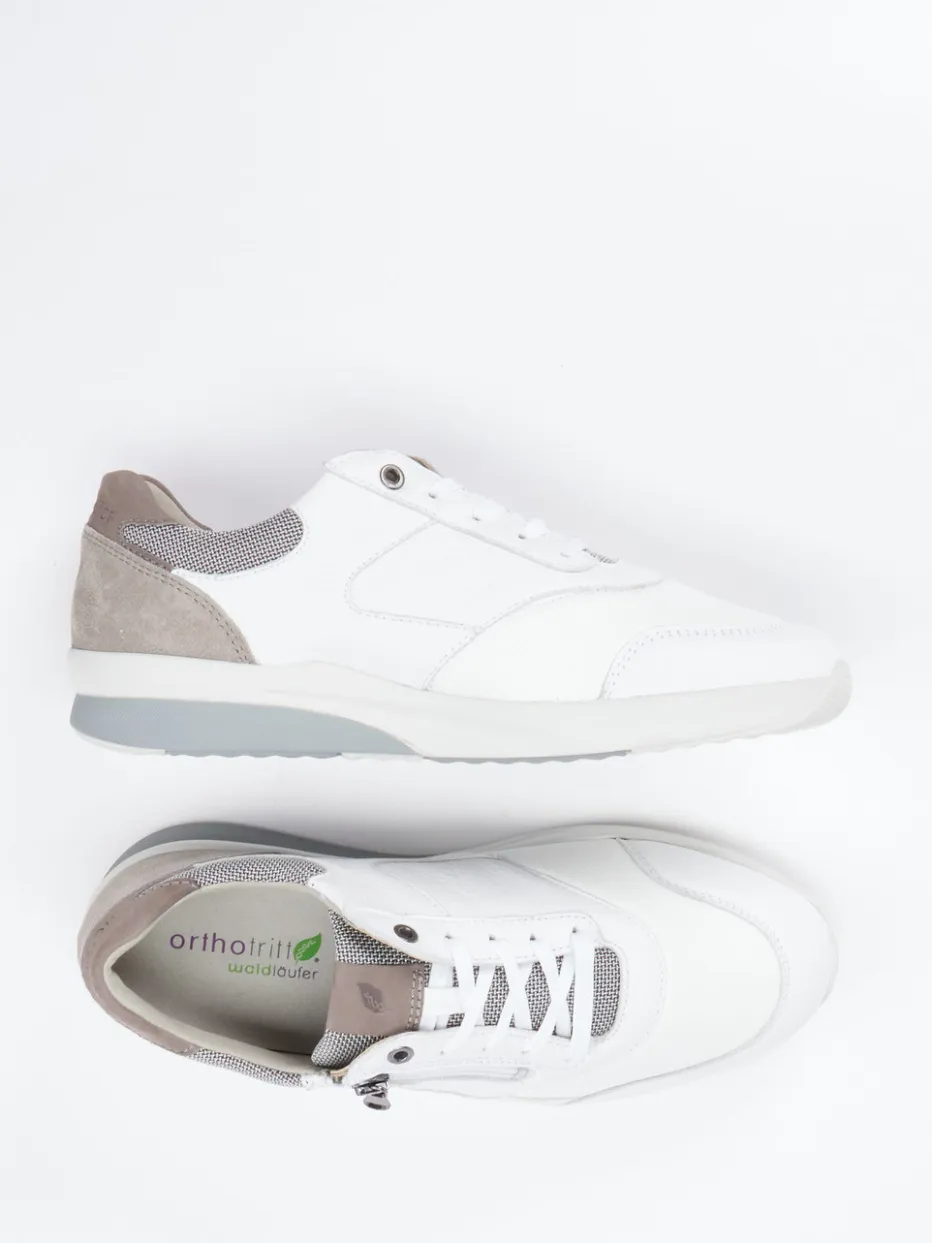 Entspannt durch den Tag mit Stil.Waldläufer verbindet sportlichen Komfort und dezentes Design in diesem Damen-Sneaker. Ideal für lange Wege oder entspannte Freizeitmomente. Der Materialmix aus weißem Kalbleder, samtigem Veloursleder und Mesh sorgt für angenehmes Trageklima und zeitgemäße Optik. Der seitliche Metallreißverschluss erleichtert das Anziehen, während gepolsterte Fersenpartie und Wechselfußbett höchsten Komfort bieten. Der klassische Schnitt in breiter Weite K unterstützt eine orthopädisch inspirierte Passform, und die profilierte Gummisohle garantiert Trittsicherheit. Dezente Farbdetails in Taupe und Hellgrau unterstreichen den minimalistischen Look – perfekt für den Comfort Sneaker Trend. Ein rundum bequemer Begleiter mit dem Qualitätsanspruch von Waldläufer.