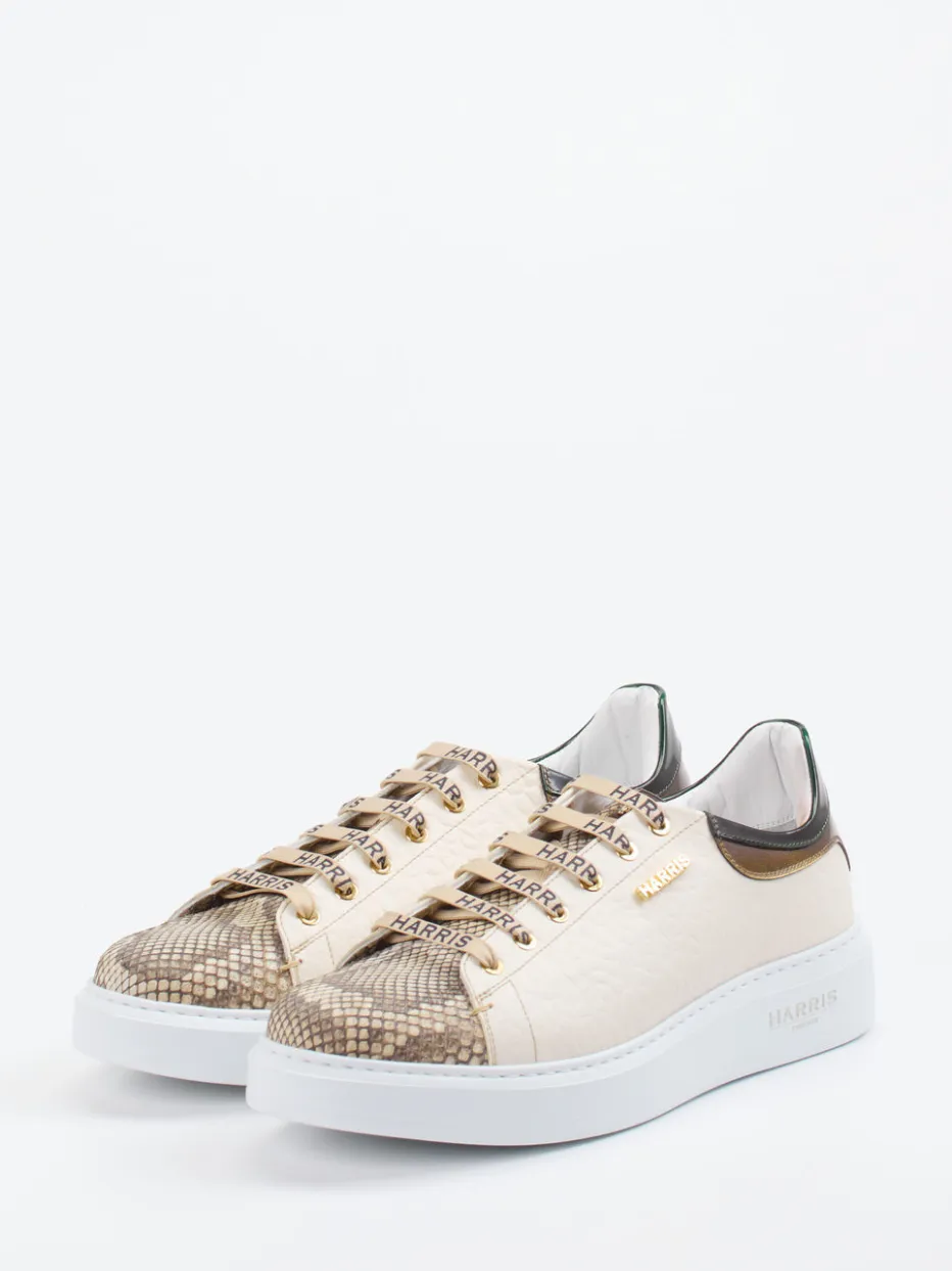 Dieser Sneaker von Harris verbindet edles Kalbleder mit exotischer Schlangenprägung. Raffinierte Details wie goldene Logos und glänzende Fersenelemente setzen stilvolle Akzente.