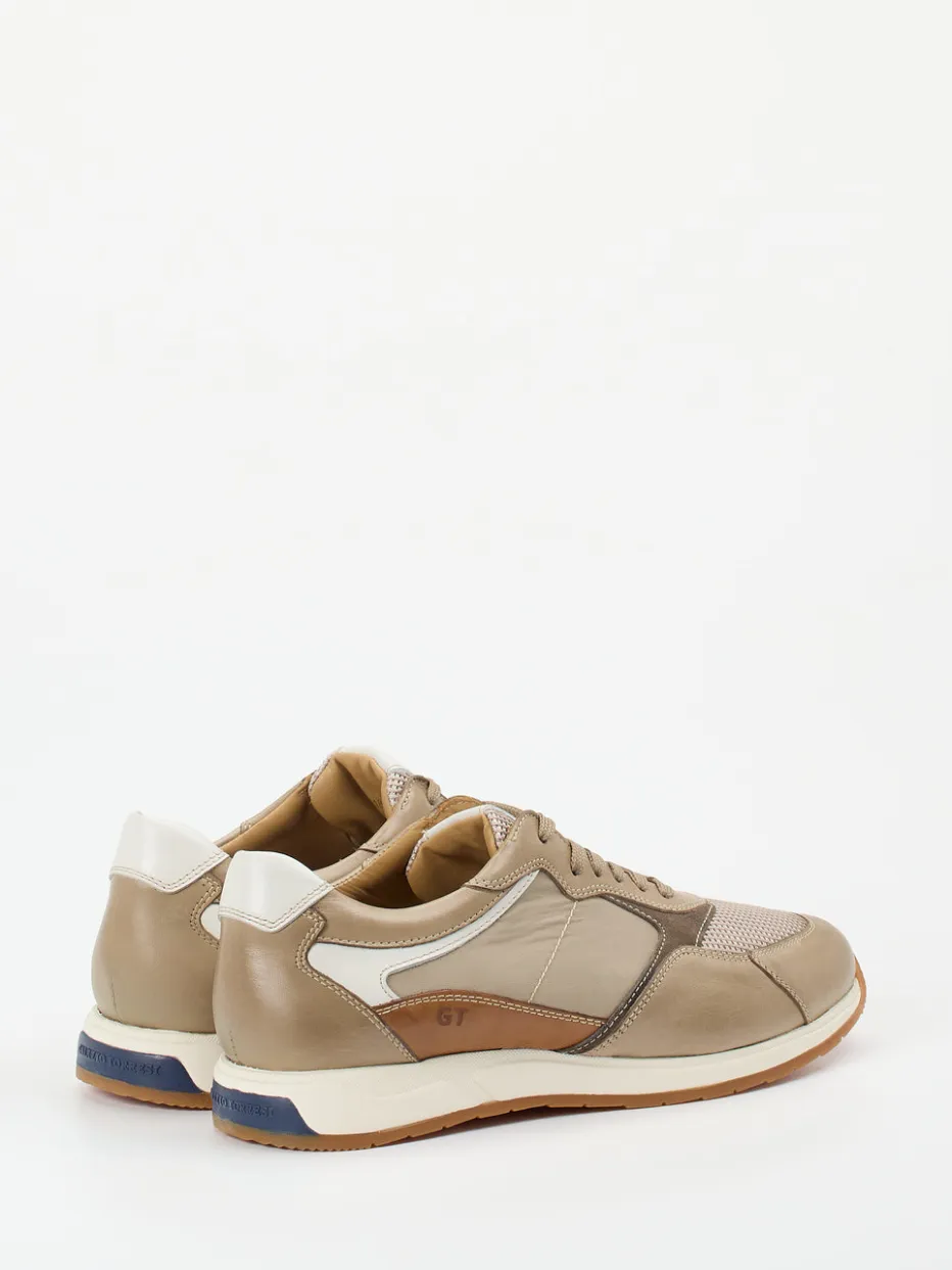 Retro-Design trifft Naturtöne.Galizio Torresi präsentiert mit diesem Herren-Sneaker eine stilvoll entspannte Variante für den Alltag. Für entspannte Stunden unterwegs bietet das Modell durch sein bequem gepolstertes Wechselfußbett und atmungsaktive Mesh-Zonen hohen Tragekomfort. Die Kombination aus beige-taupefarbenem Kalbleder mit glatter, matter Oberfläche und Mesh-Einsätzen sorgt für ein harmonisches, modernes Erscheinungsbild. Dezente Kontraste an Ferse und Sohle, klassische Schnürung und Logo-Prägung unterstreichen die schmale Retro-Silhouette. Der Look passt perfekt in die ruhigen Farbwelten der Saison und wird durch „Quiet Luxury“-Anleihen modern ergänzt. Besonders lässig zur naturfarbenen Chino. Ein Galizio Torresi Sneaker, bei dem Komfort und Design in natürlicher Balance stehen.