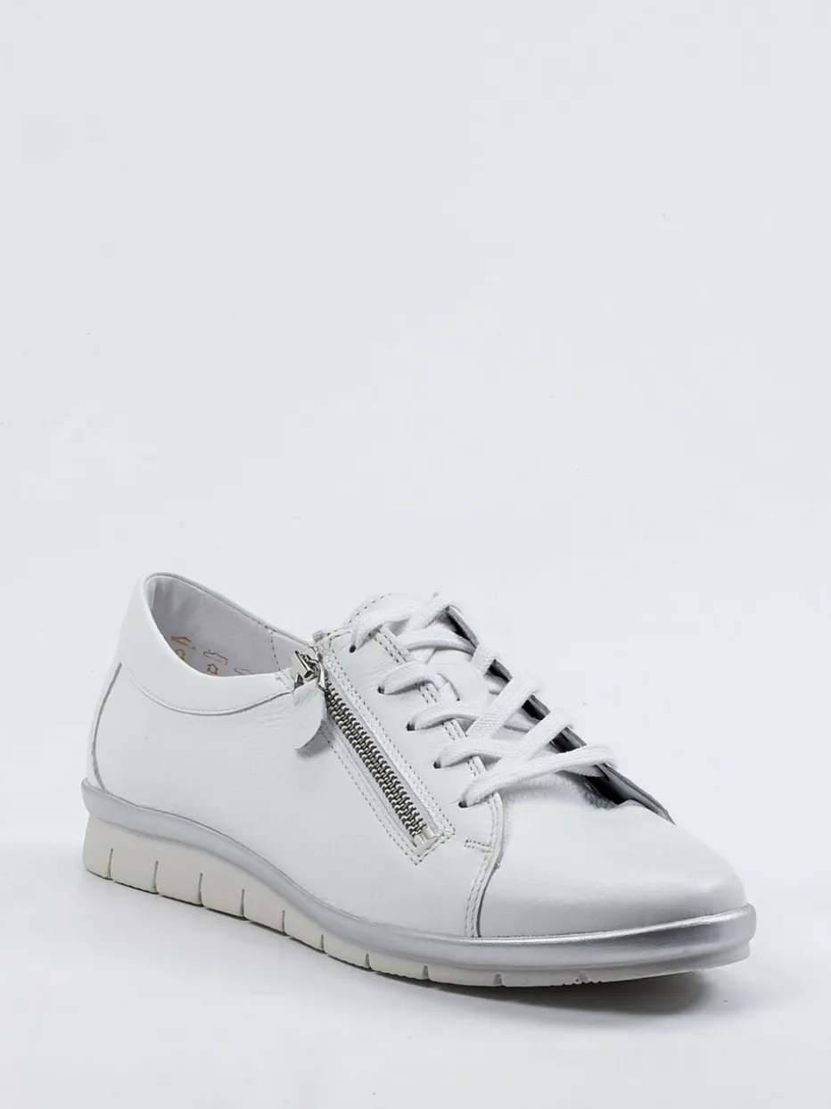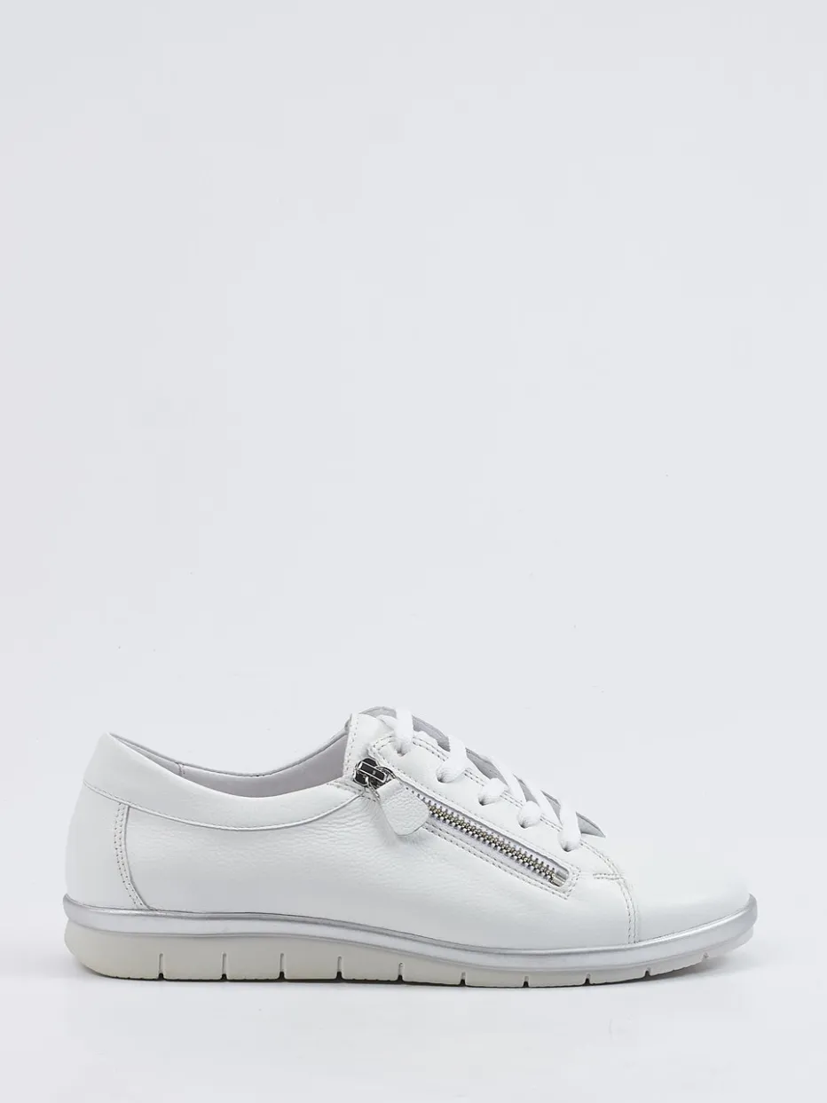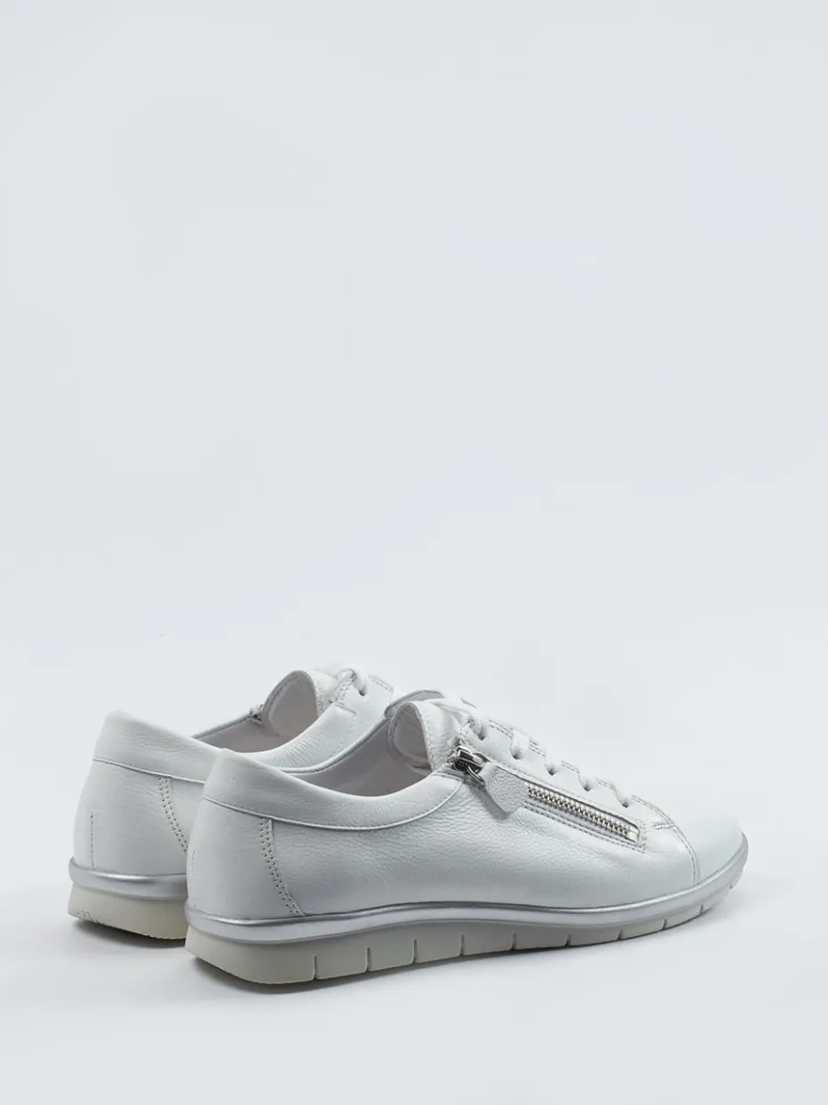 Schlichte Eleganz für entspannte Alltagsmomente.Christian Dietz präsentiert mit diesem Sneaker ein Damenmodell der Linie Verona in bequemer Weite H. Ideal für urbane Freizeitlooks, kombiniert dieser Low-Top Sneaker weißes Kalbleder mit genarbter Oberfläche und einem subtilen silberfarbenen Zierstreifen an der Sohle. Die klare, flach gehaltene Silhouette wird durch eine feine Schnürung und einen praktischen Reißverschluss ergänzt. Ein ledernes Innenfutter sowie ein herausnehmbares Fußbett sorgen für angenehmen Tragekomfort – auch barfuß tragbar. Der cleane Look fügt sich perfekt in den aktuellen „Quiet Luxury“-Trend ein und lässt sich vielseitig mit hellen Casual-Outfits oder leichten Jacken kombinieren. Hochwertig verarbeitet mit Fokus auf Alltagstauglichkeit und Designklarheit.