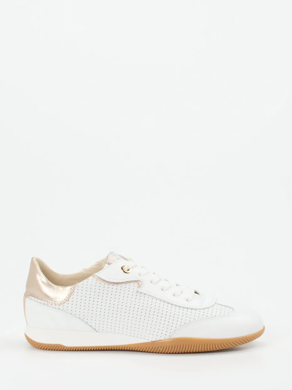 Sportlicher Chic mit edlem Glanz.DL Sport präsentiert mit diesen Sneakern ein modernes Freizeitmodell für Damen. Ein leichter Begleiter für Tage, an denen Komfort und Stil gefragt sind. Das weiße Kalbleder wirkt edel und ist mit perforierten Partien versehen, die die Atmungsaktivität erhöhen. Tonige Leder-Overlays und ein schmaler Schnitt formen die cleane Silhouette. Dezente Hingucker sind das roségoldene Metallicelement an der Ferse sowie goldfarbene Ösen. Die honigfarbene Gummisohle sichert leichten Trittkomfort. Ein sportiv-eleganter Klassiker für Office und Alltag, optimal kombinierbar mit Trenchcoat oder Crossbody-Bag. Hochwertige Materialien und subtile Details machen dieses Modell zu einem langlebigen Favoriten mit Stilanspruch.
