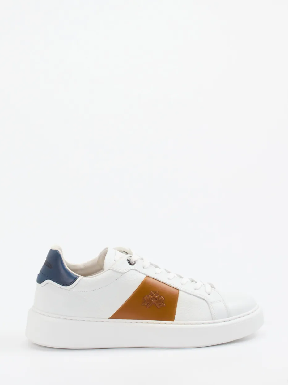 Puristischer Look mit mediterraner Raffinesse.Der Herren-Sneaker von La Martina zeigt sich als stilsicherer Allrounder. Klares Weiß trifft auf sanft genarbtes Kalbleder, ergänzt durch cognacfarbene Logo-Elemente und einen dunkelblauen Fersenbesatz – perfekt für moderne Outfits mit diskretem Color-Blocking. Die klassische, runde Form mit geprägtem Markenlogo und kontrastierenden Besätzen unterstreicht die hochwertige Verarbeitung. Gummisohle, lederbezogenes Fußbett und Schnürung bieten Tragekomfort im Alltag wie im Büro. Ein Schuh, der modische Zurückhaltung mit italienischer Ästhetik vereint. La Martina steht für souveräne Eleganz mit detailverliebtem Designanspruch.