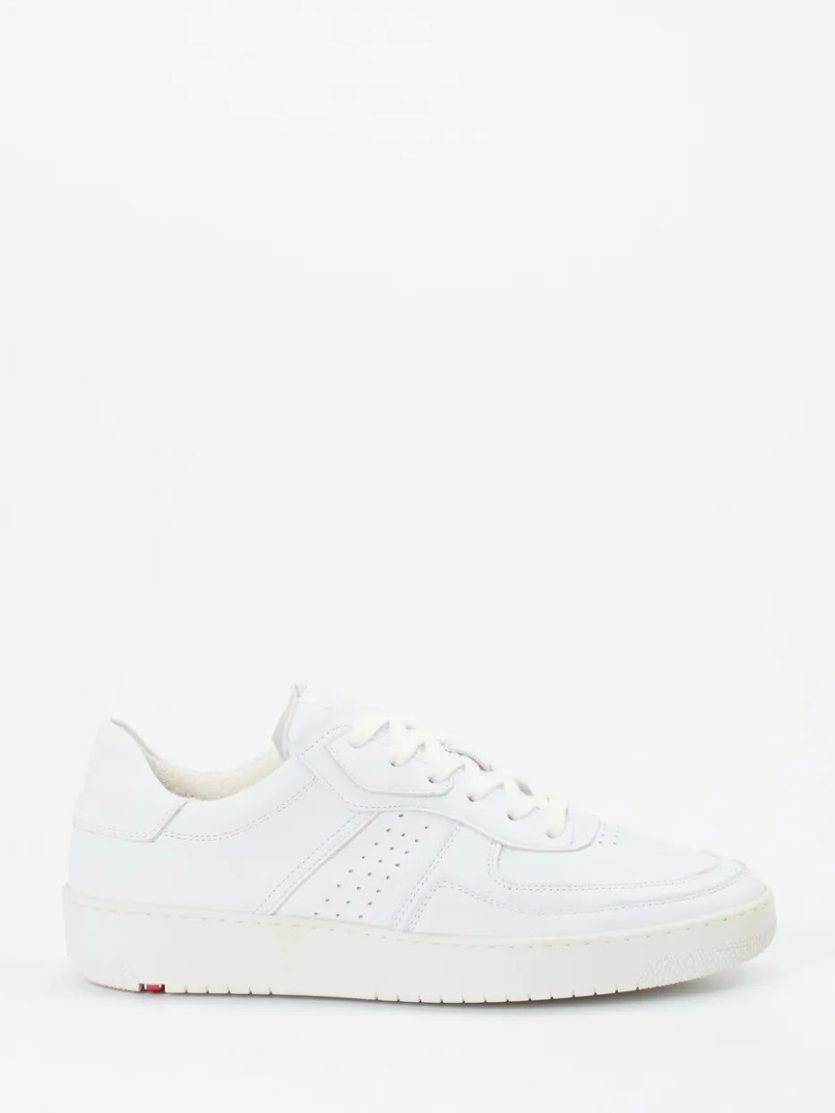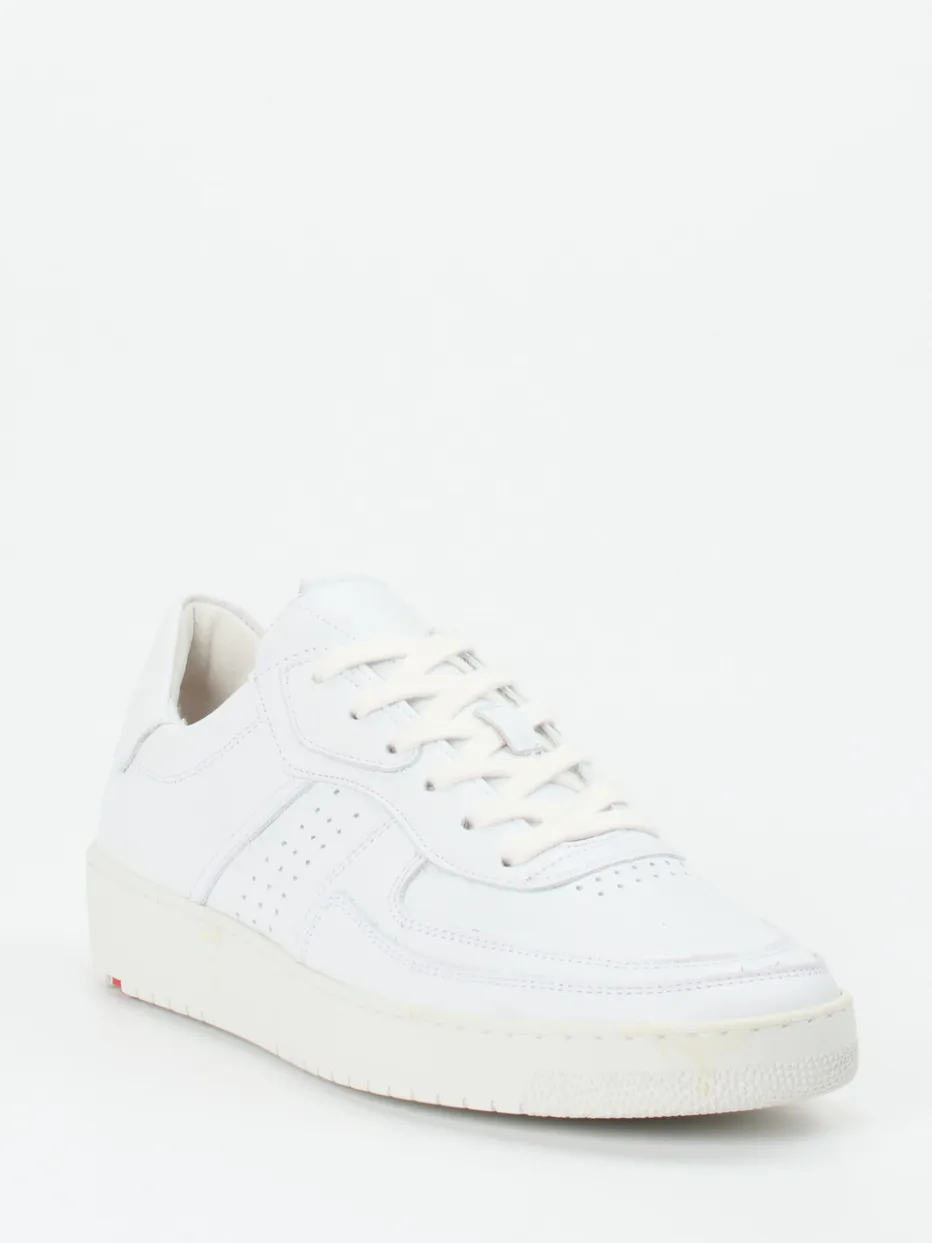 Ob im Büro oder in der Freizeit – der Low-Top-Sneaker aus weißem, glattem Kalbleder überzeugt durch klare Linien, tonale Nähte und perforierte Seitenteile. Rote Akzente an der Gummisohle setzen einen feinen Kontrapunkt zum cleanen Look. Innen sorgt ein weiches Frottee-Futter mit gepolsterter, herausnehmbarer Innensohle für hohen Komfort. Die klassische, runde Silhouette sowie eine Symmetrie in der Schnürung unterstreichen den minimalistischen Auftritt. Kombiniert mit Chinohose oder Anzug schafft er stilvolle Kontraste.