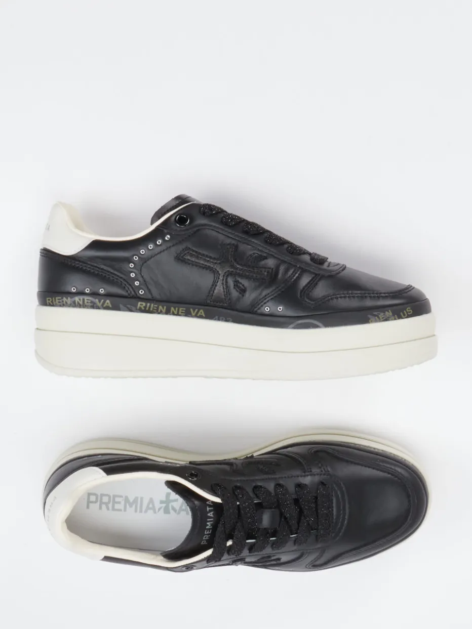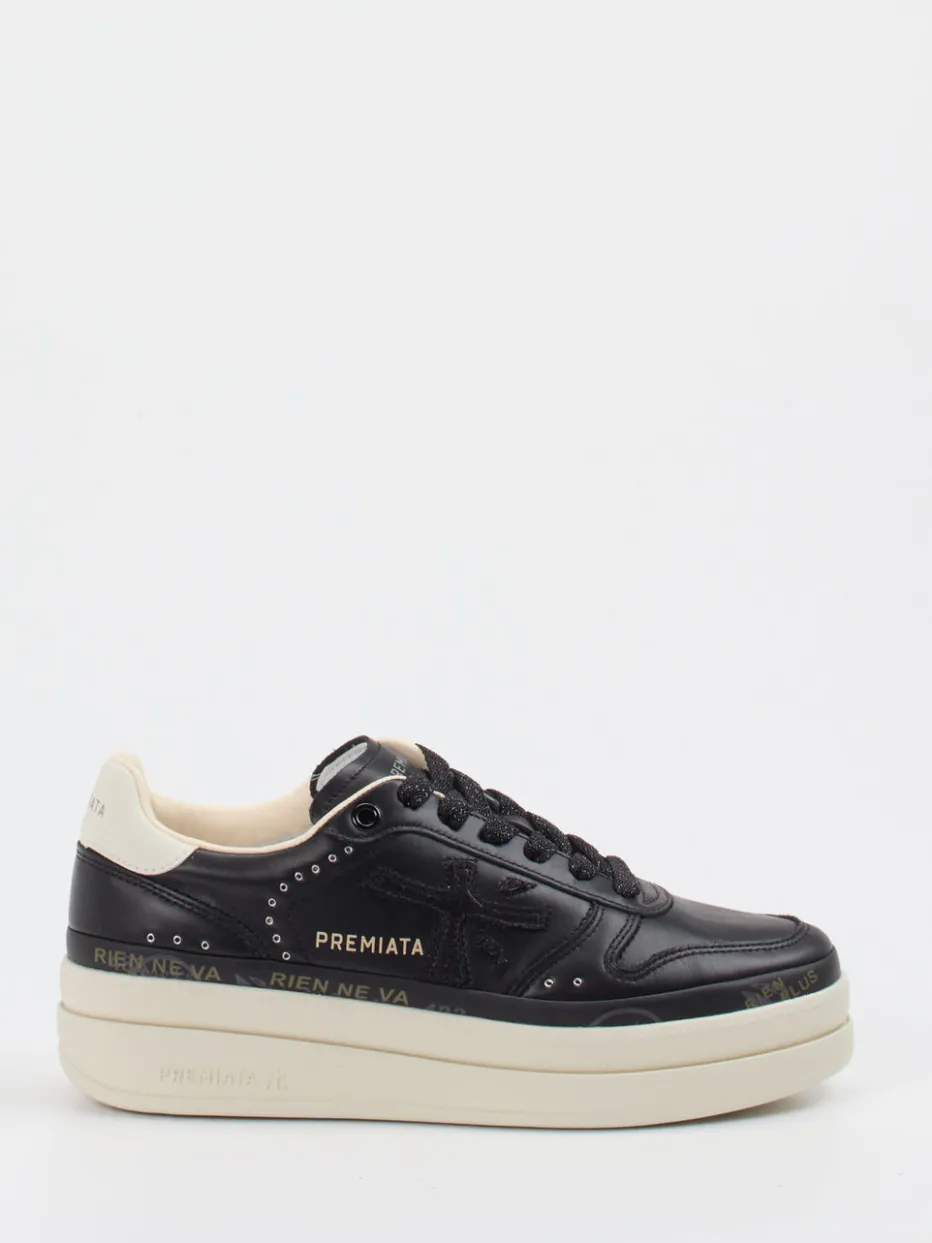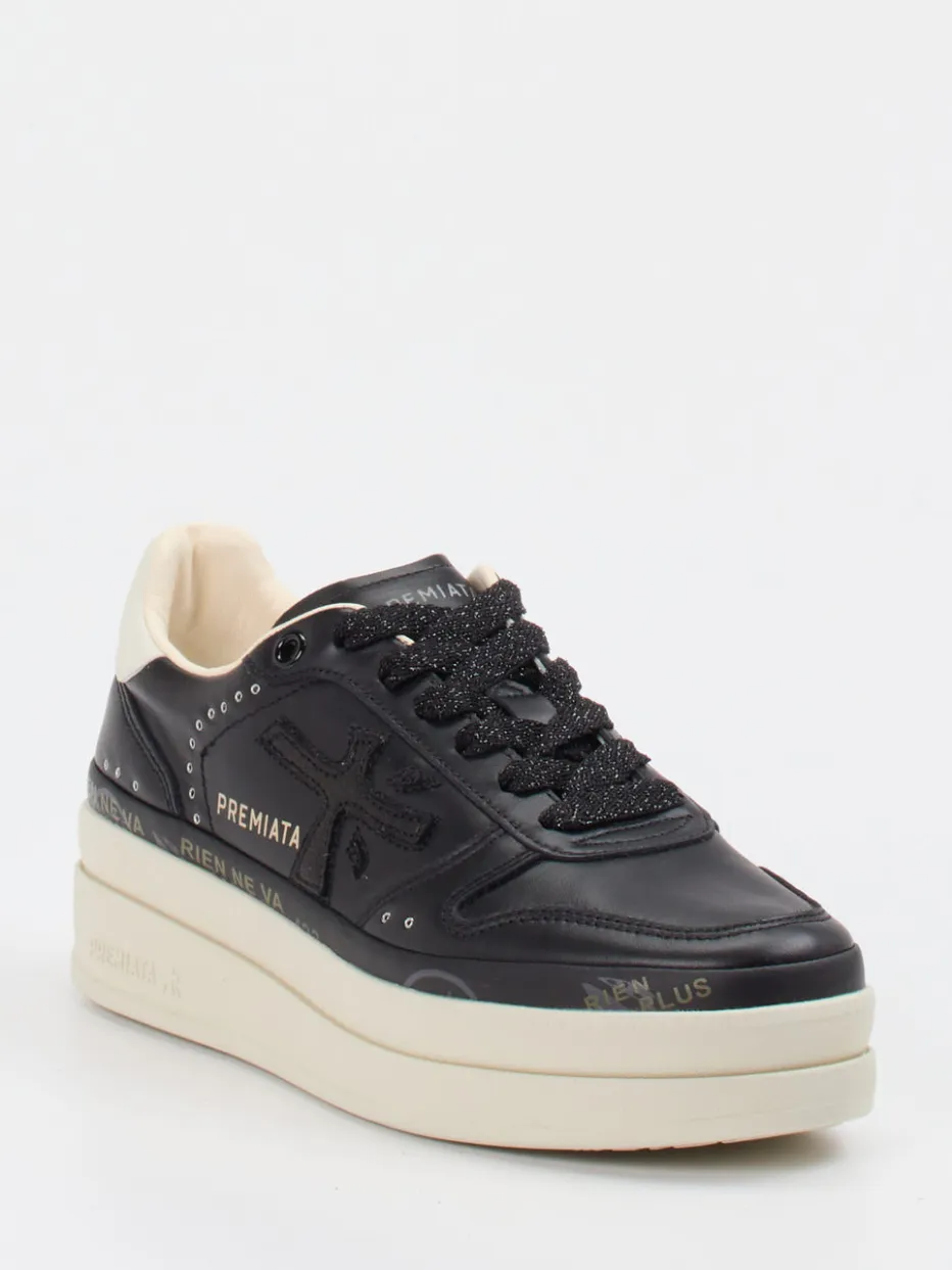 Streetstyle trifft Premium-Anmutung.Premiata interpretiert den Damen-Sneaker neu – modisch, kraftvoll und markant. Ob für urbane Alltagswege oder legere Partyszenarien: Der Plateausneaker kombiniert schwarzes Kalbleder mit glänzender Oberfläche und einem weißen Innenfutter aus luxuriösem Leder. Schwarze Glitzerschnürsenkel, silberfarbene Ösen sowie Markenprägungen an Ferse und Sohle unterstreichen die moderne Formsprache. Die profilierte Gummisohle mit 4,5 cm Absatzhöhe verleiht Stabilität und ein Plus an Dynamik. Streetwear-Einflüsse treffen auf minimalistischen Chic – ideal für modisch selbstbewusste Styles. Raffinesse und Tragekomfort in ikonischer Silhouette – typisch Premiata.