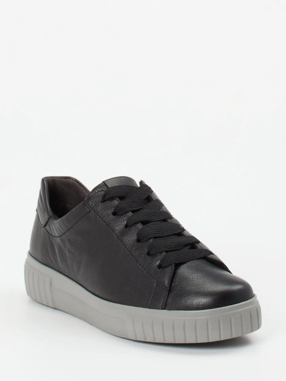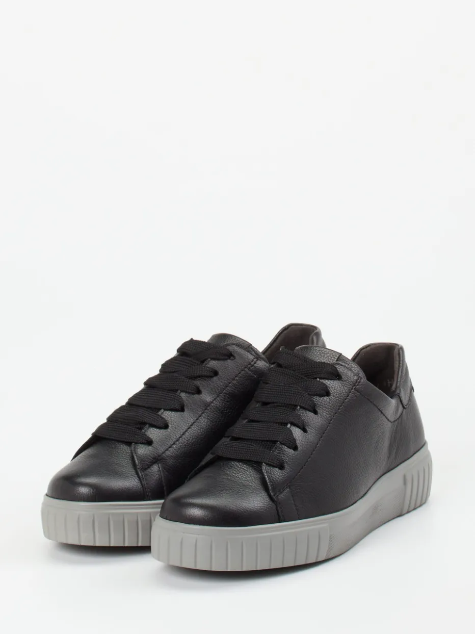 Ob im Office oder bei urbanen Erkundungstouren – das genarbte Kalbleder in sattem Schwarz unterstreicht die hochwertige Anmutung. Die runde Silhouette, breite Schnürbänder und die tonige Verarbeitung sorgen für ein zurückhaltend-edles Gesamtbild. Dank gepolstertem Schaft, PU-Luftpolstersohle mit Rillenprofil und Wechselfußbett ist ganztägiger Komfort garantiert. Inspiriert von Streetwear und dem Trend zu Monochrome Looks, passt der Sneaker ideal zur schmal geschnittenen Stoffhose wie zur weiten Jeans.