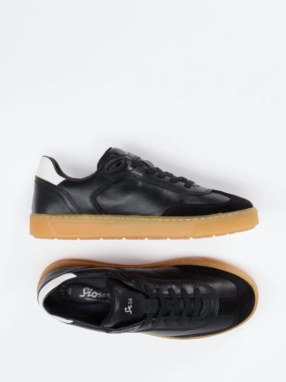 Retro trifft Komfort in Bestform.Sioux vereint mit diesem schwarzen Sneaker klassisches Sneaker-Design und modernen Komfort. Ob beim Spaziergang durch die Stadt oder auf Reisen – der Mix aus glattem und samtig angeschliffenem Kalbleder sorgt für eine wertige Ausstrahlung und angenehmen Sitz. Schwarzes Leder wird durch toniges Veloursleder, einen weißen Fersenbesatz sowie eine kontrastierende honigfarbene Gummisohle ergänzt. Die California-Machart und das atmungsaktive Frotteefutter bieten besondere Flexibilität und ein gutes Fußklima. Ideal für minimalistische Streetwear-Styles oder lässige Denim-Outfits. Ein durchdachter Freizeitschuh in typischer Sioux-Qualität mit Fokus auf Komfort und Materialästhetik.
