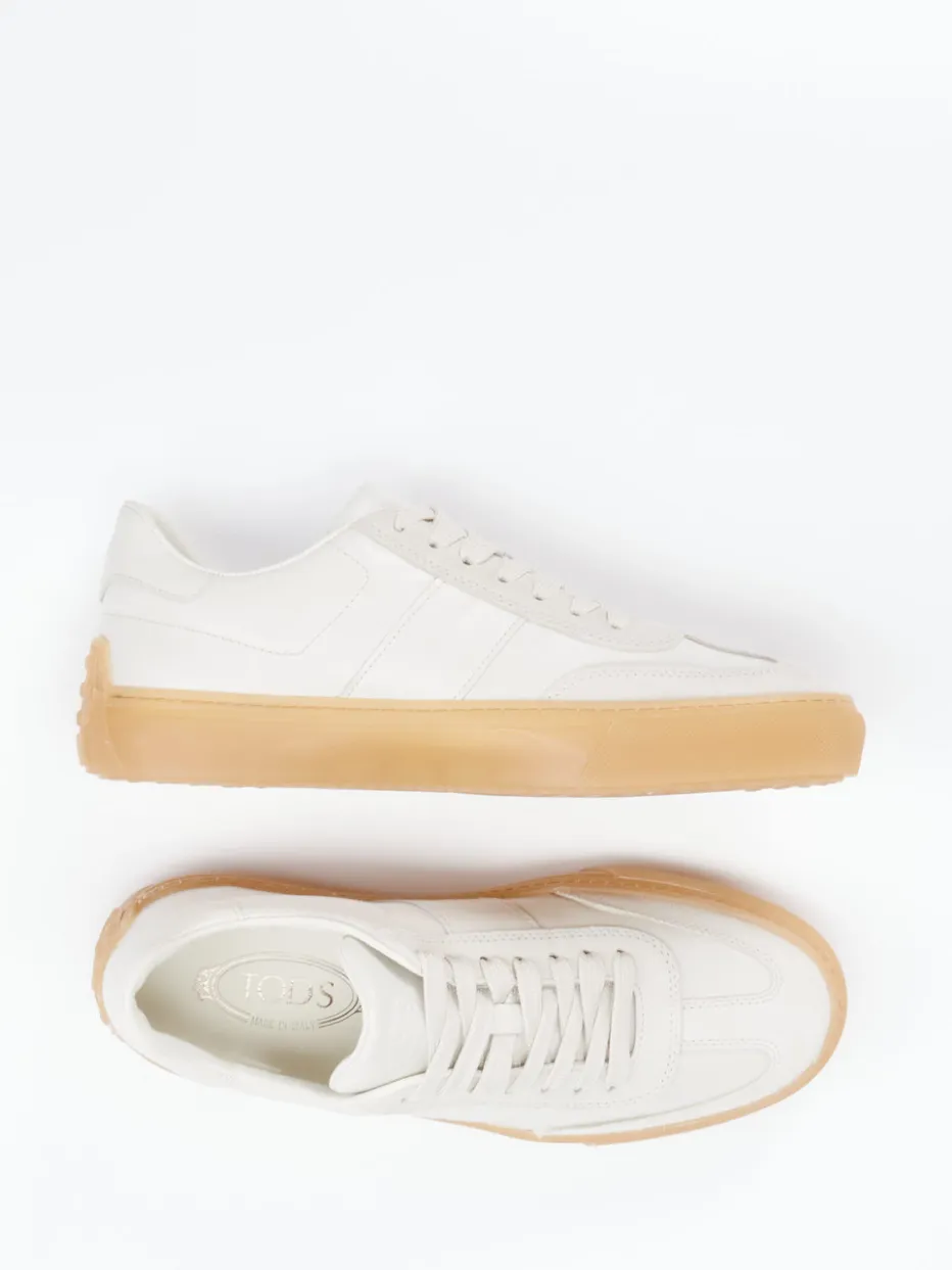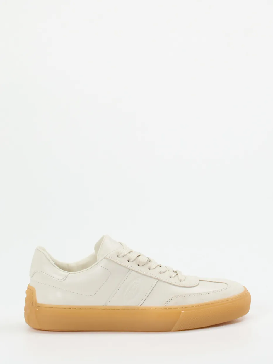 Leiser Luxus für den Alltag.Der Sneaker von Tod’s vereint kompromisslose Verarbeitung und zurückhaltendes Design. Für moderne Casual-Settings wie Büro oder City-Termine bietet der Schuh durch das hochwertige Kalbleder mit glatt-velouriger Struktur ein stilvolles Finish. Die cremebeige Farbgebung unterstreicht die klassische Silhouette, ergänzt durch eine karamellfarbene Gummisohle mit Profil. Dezente Logoprägung und Lederapplikationen an Ferse und Seite ergänzen das klare Gesamtbild. Der Schuh passt ideal in die Trends Quiet Luxury und Retro Court Styles der Saison. Lässt sich stilvoll mit Strick und Lederaccessoires kombinieren. Hochwertige Lederqualität trifft auf Alltagstauglichkeit im Design von Tod’s.