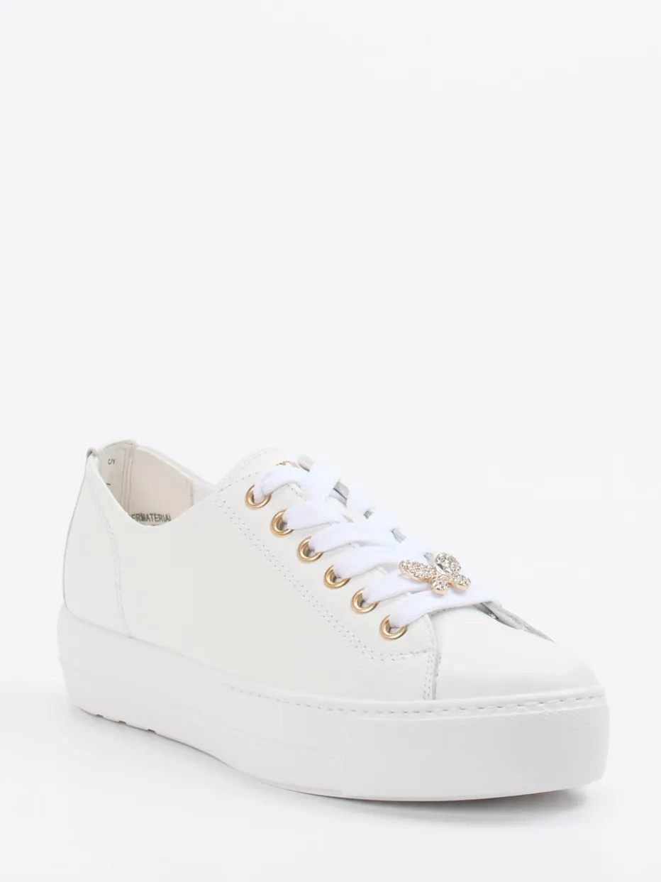 Casual Chic mit femininem Glanz.Der weiße Low-Top Sneaker von Paul Green vereint Minimalismus mit modischer Raffinesse. Ob als stilvolle Ergänzung zum sommerlichen Freizeitlook oder als glanzvoller Akzent im Party-Outfit – dieser Schuh überzeugt mit glattem, genarbtem Kalbleder und liebevoll verarbeiteten Details. Goldfarbene Ösen und ein funkelnder, abnehmbarer Schmetterling setzen feminine Highlights. Die klassisch abgerundete Silhouette wird durch die 3,5 cm hohe Plateau-Gummisohle betont, die Streetwear-Flair und Komfort bietet. Optimal kombinierbar mit weißen Taschen oder goldfarbenen Accessoires. Ein femininer Trendsneaker mit der typischen Passform-Kompetenz von Paul Green.