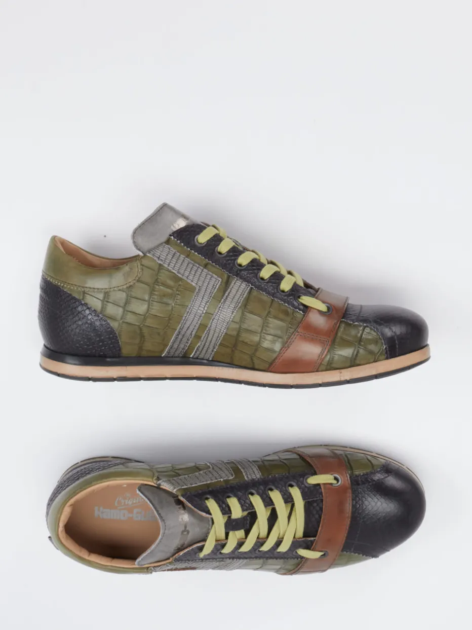Retro trifft Reptilstruktur.Kamo Gutsu zeigt mit diesem Herren-Sneaker der Linie Tifo 030 ein stilvolles Modell für Alltag und Freizeit. Das Design verbindet olivgrünes Kalbleder mit Kroko-Prägung und kontrastierenden Elementen in Schwarzblau sowie cognacfarbenen Zierstreifen. Die klassische flache Silhouette mit sportlicher Schnürung wird durch Kontrastnähte und metallische Details akzentuiert. Innen sorgt ein hochwertiges Lederfutter samt gepolstertem Wechselfußbett für Komfort. Der Look vereint Streetwear mit dem Trend „Quiet Luxury“ – ideal zu grauen Jeans oder olivgrüner Bomberjacke. Hochwertige Materialien und Retro-inspirierte Details prägen die Handschrift von Kamo Gutsu.