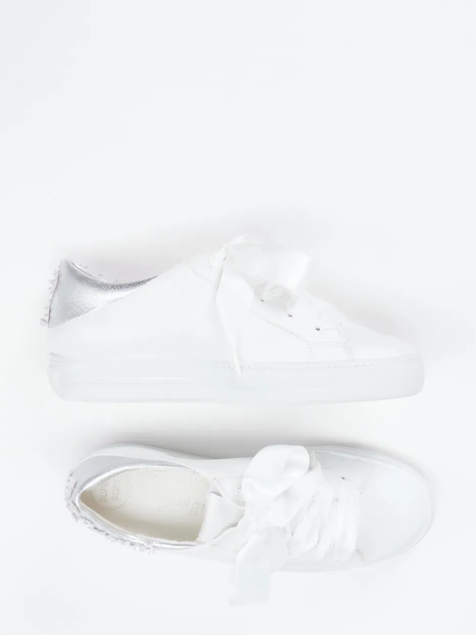 Dieser feminine Sneaker kombiniert weißes Kalbleder mit floralen Applikationen und einer markanten Satinbandschnürung – ideal für stilbewusste Casual-Outfits.