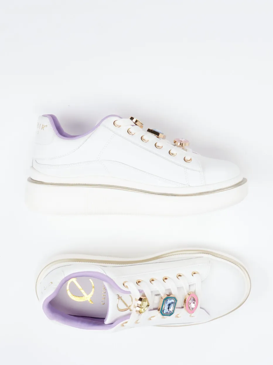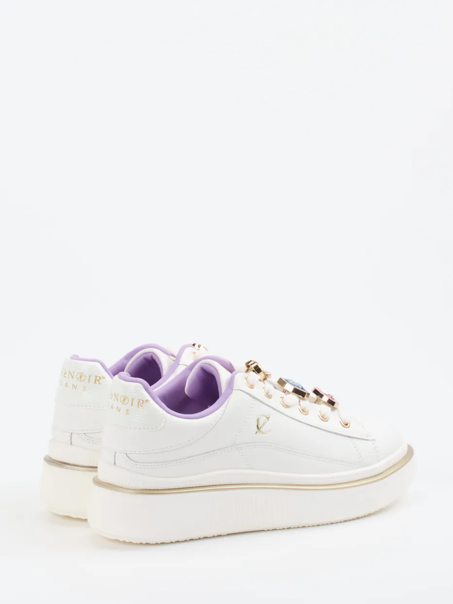 Funkelnd im Fokus.CAFèNOIR bringt mit diesem Damen-Sneaker frischen Glanz in die Streetwear-Kategorie. Ideal für lebendige Alltagsmomente genauso wie für expressive Partynächte zeigt sich das Modell aus hochwertigem Kalbleder mit glänzender Oberfläche. Off-White und fliederfarbene Töne bestimmen den Look ebenso wie die auffällige Schmucksteinverzierung samt goldfarbener Akzente an Ösen und Sohlenlinie. Die Plateausohle unterstreicht den chunky Charakter und verleiht urbanes Volumen. Inspiriert vom Y2K-Trend überzeugen diese Sneaker in Kombination mit monochromen Pastell-Outfits oder oversized Streetwear-Komponenten. CAFèNOIR verbindet luxuriöse Materialien mit charakterstarkem Design.
