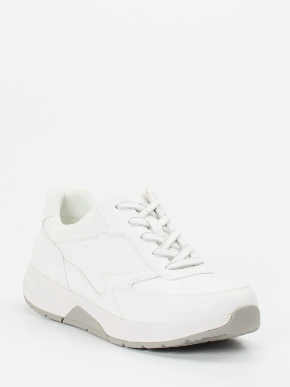 Funktionaler Klassiker mit Komfort-DNA.Die Marke Gabor Comfort präsentiert einen elegant-sportiven Damen-Sneaker, der Komfort und Stil harmonisch vereint. Ideal für aktive Tage bietet das Modell dank ergonomischer Rollingsoft-Sohle ein spürbar natürliches Abrollverhalten. Gefertigt aus weißem Kalbleder mit matter Oberflächenstruktur, vereint es klassische Rundform mit tonalen Nähten und dezentem Branding an Ferse und Sohle. Details wie gepolsterter Schaft, weiches Textilfutter und individuell anpassbare Schnürung unterstreichen den Tragekomfort. Die profilierte Gummisohle verleiht sicheren Halt, während der minimalistische Look von Streetwear und „Comfort First“-Designs inspiriert ist. Lässt sich hervorragend zu legeren Outfits kombinieren. Ein durchdachter Alltagsbegleiter mit Fokus auf langlebigem Wohlfühlkomfort.