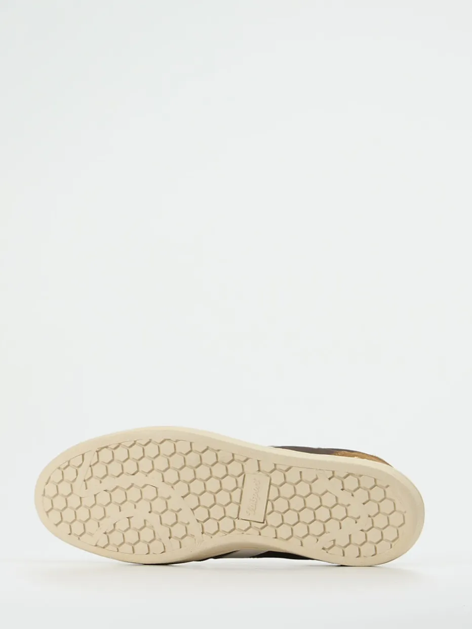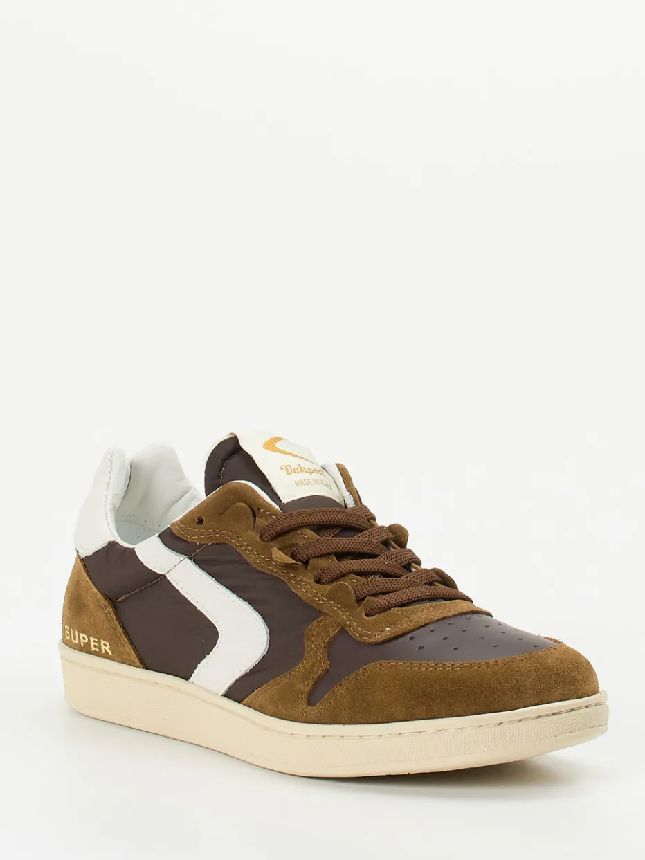 Retro-Charme in warmen Brauntönen.Valsport präsentiert mit diesem Unisex-Sneaker ein Modell der Serie „Super“, das zeitlosen Y2K-Style mit moderner Sportlichkeit kombiniert. Für urbane Alltagsmomente bietet der Schuh eine harmonische Materialmischung aus weichem Kalbleder, samtig angeschliffenem Veloursleder und strukturiertem Nylon. Die dominante Farbwelt in Schokoladen- und Kastanienbraun wird durch Off-White-Akzente auf Sohle und Zehenkappe kontrastiert. Detailreiche Highlights wie ein goldfarbener „SUPER“-Schriftzug, perforierte Frontpartie und seitliches Logo-Element unterstreichen den Streetwear-Appeal. Der flache Schnitt und das gepolsterte Innenleben sorgen für hohen Tragekomfort – auch mit Einlagen. Lässig kombinierbar mit Jogpants oder Oversized-Hoodie. Valsport verbindet italienisches Design mit authentischem Retro-Flair für stilvolle Freizeitabenteuer.
