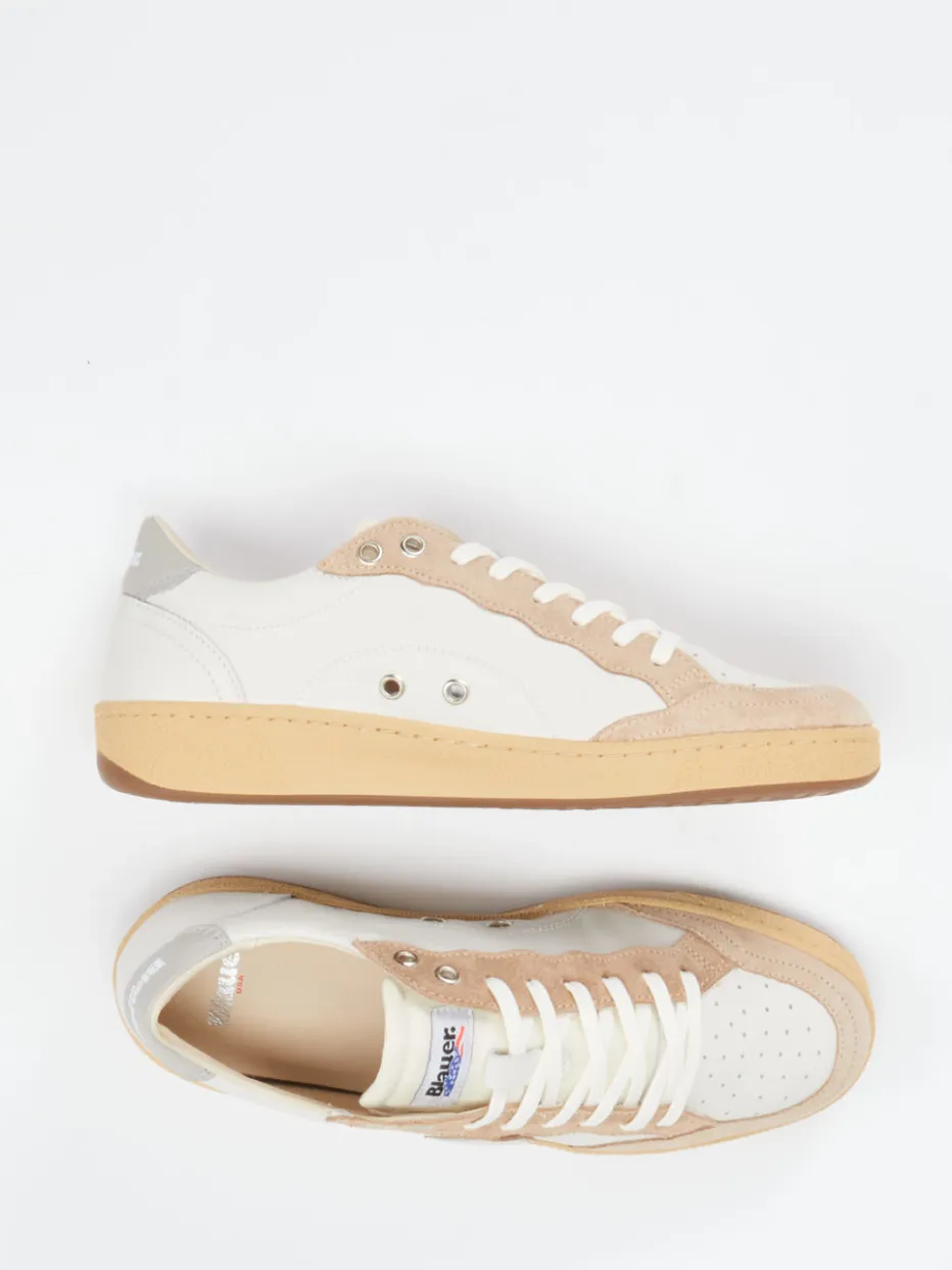 Retro-Chic mit klarer Formsprache.Die amerikanische Marke Blauer bringt mit diesem Sneaker einen Streetstyle-Klassiker zurück auf die Bildfläche. Fein genarbtes Kalbleder in Cremeweiß trifft auf taupefarbenes Veloursleder mit weicher Textur. Die klassische flache Silhouette wird durch eine perforierte Zehenbox, Ton-in-Ton-Metallösen und ein seitliches Logo-Patch akzentuiert. Die funktionale Gummisohle bietet verlässlichen Grip. Inspiriert vom Vintage-Court-Stil der 90er, passt das Modell ideal zu entspannten Looks zwischen Freizeit und Sommerurlaub. Besonders harmonisch wirkt es zu beiger Chino und Oversize-Shirts. Blauer verbindet gestalterischen Purismus mit anspruchsvoller Materialverarbeitung.